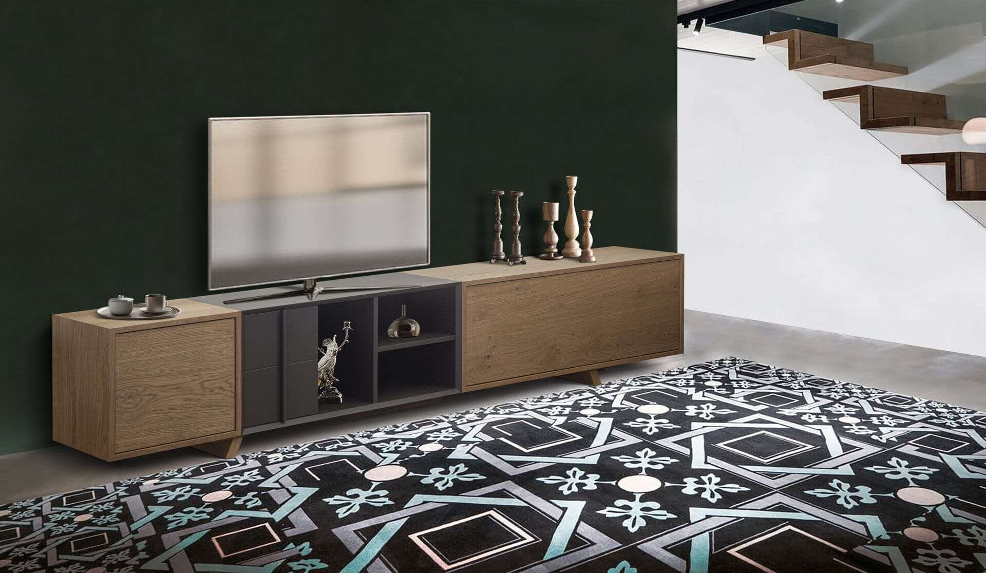 Έπιπλο TV Cozy με ξύλο δρυς ρουστίκ και λακαριστές λεπτομέρειες με επιλογή χρώματος. Νεανικό design για κάθε χώρο, με ευρύχωρα ντουλάπια και εξωτερικές θέσεις για ντεκόρ και συσκευές. Κατασκευάζεται με φυσικά υλικά σε χρώματα και διαστάσεις της επιλογής σας.