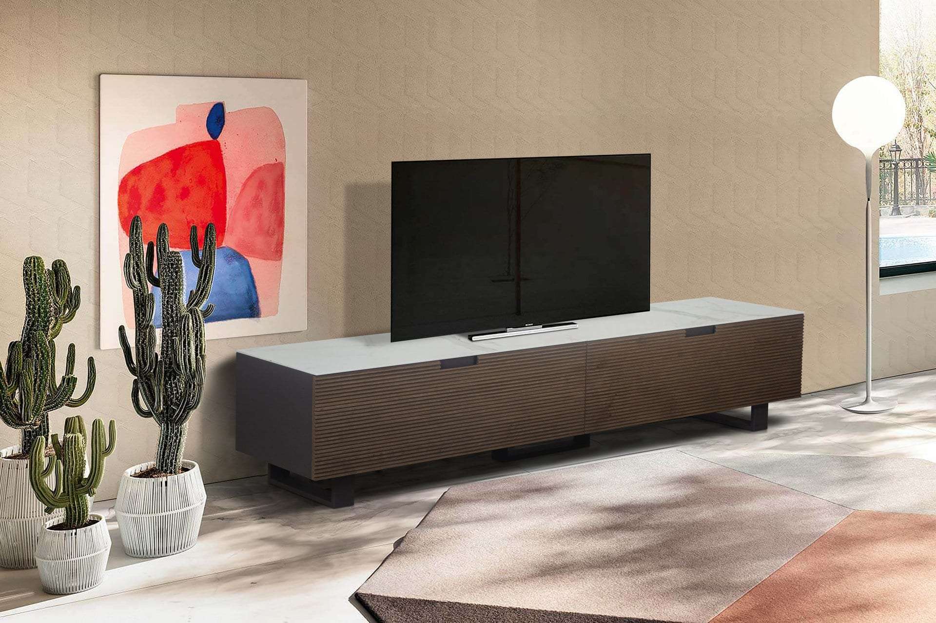 Έπιπλο TV Scratch. Ελληνικής Κατασκευής. Εύκαμπτο μασίφ δρυς και λεπτομέρειες λάκας, επιφάνεια κεραμική με επιλογή για Ματ ή Γυαλιστερό. Κατασκευάζεται με ποιοτικά υλικά σε χρώματα και σε διαστάσεις της επιλογής σας.
