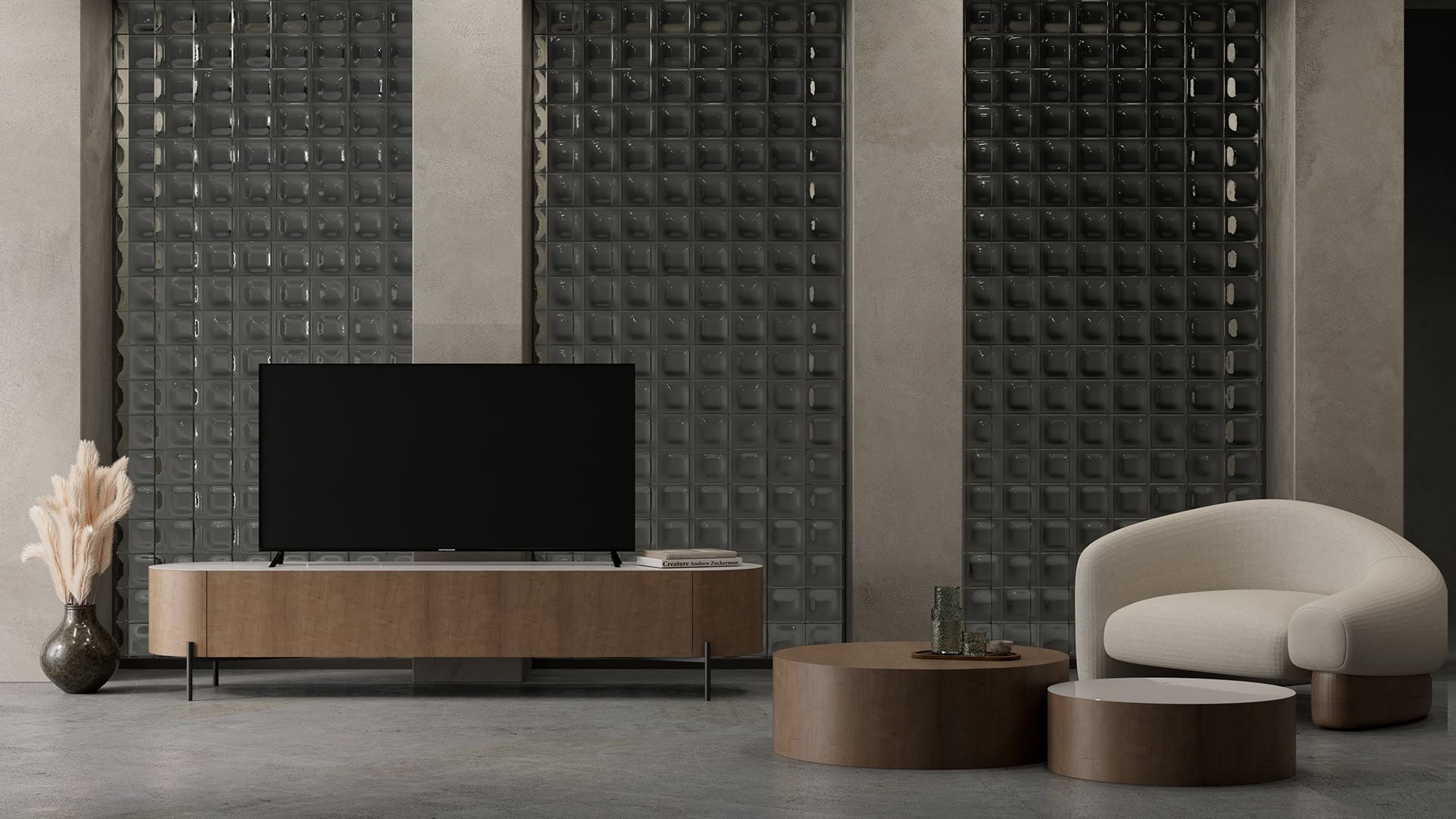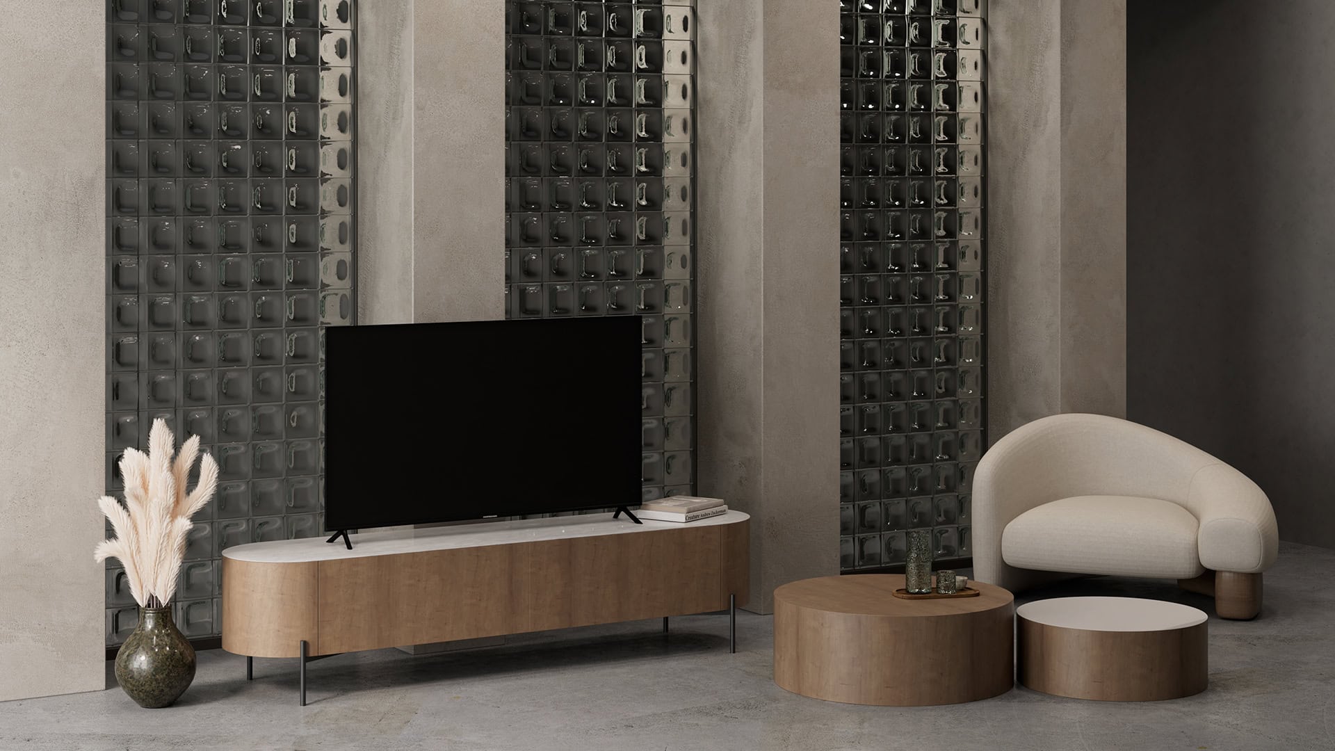 Έπιπλο TV Torus. Ελληνικής Κατασκευής. Ξύλο: Εύκαμπτο δρυς και κεραμικό κατόπιν επιλογής Επιφάνεια κεραμική με επιλογή για Ματ ή Γυαλιστερό, σε πολλά χρώματα. Διάσταση TV: 200cm Δυνατότητα αλλαγών.