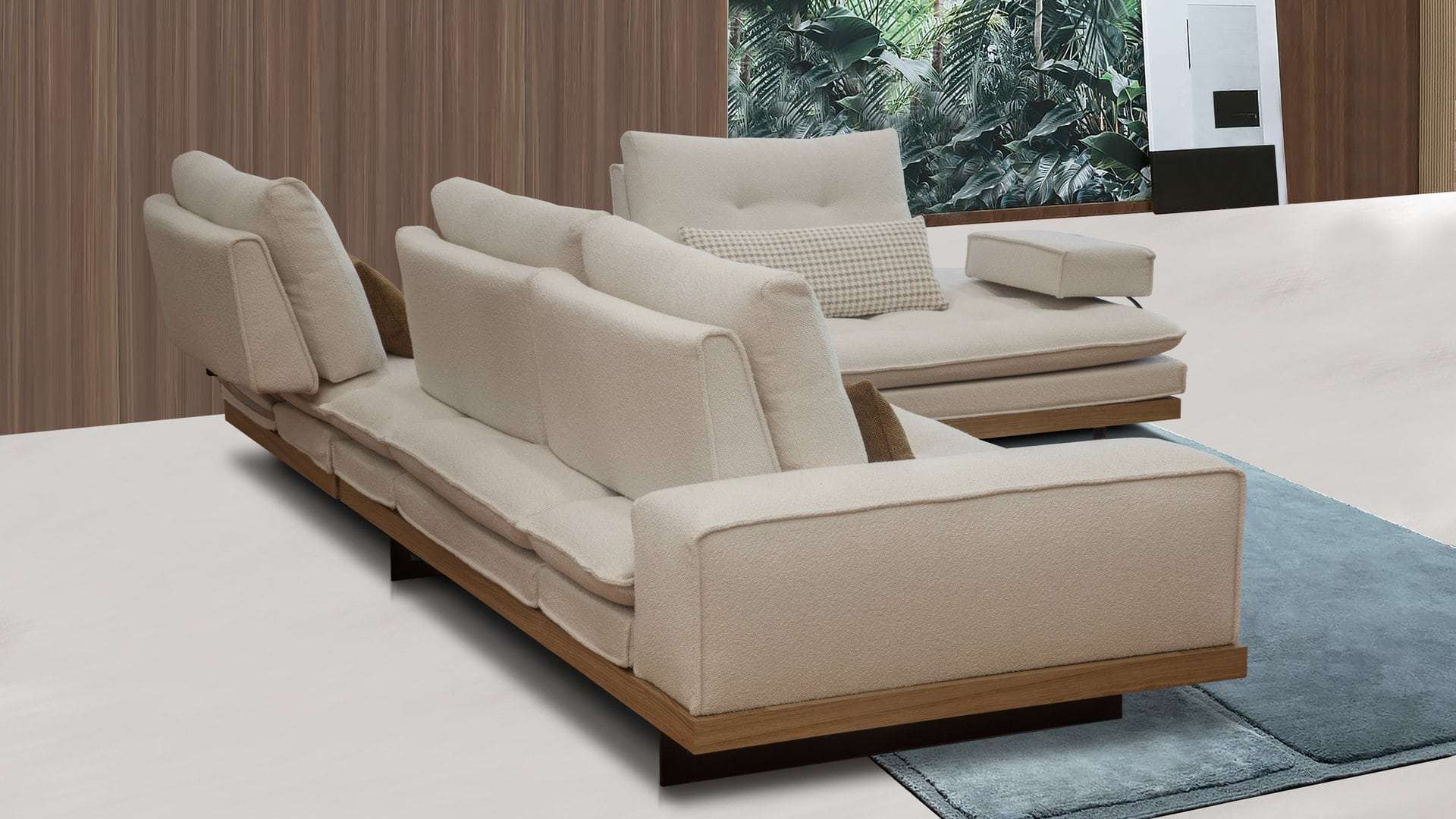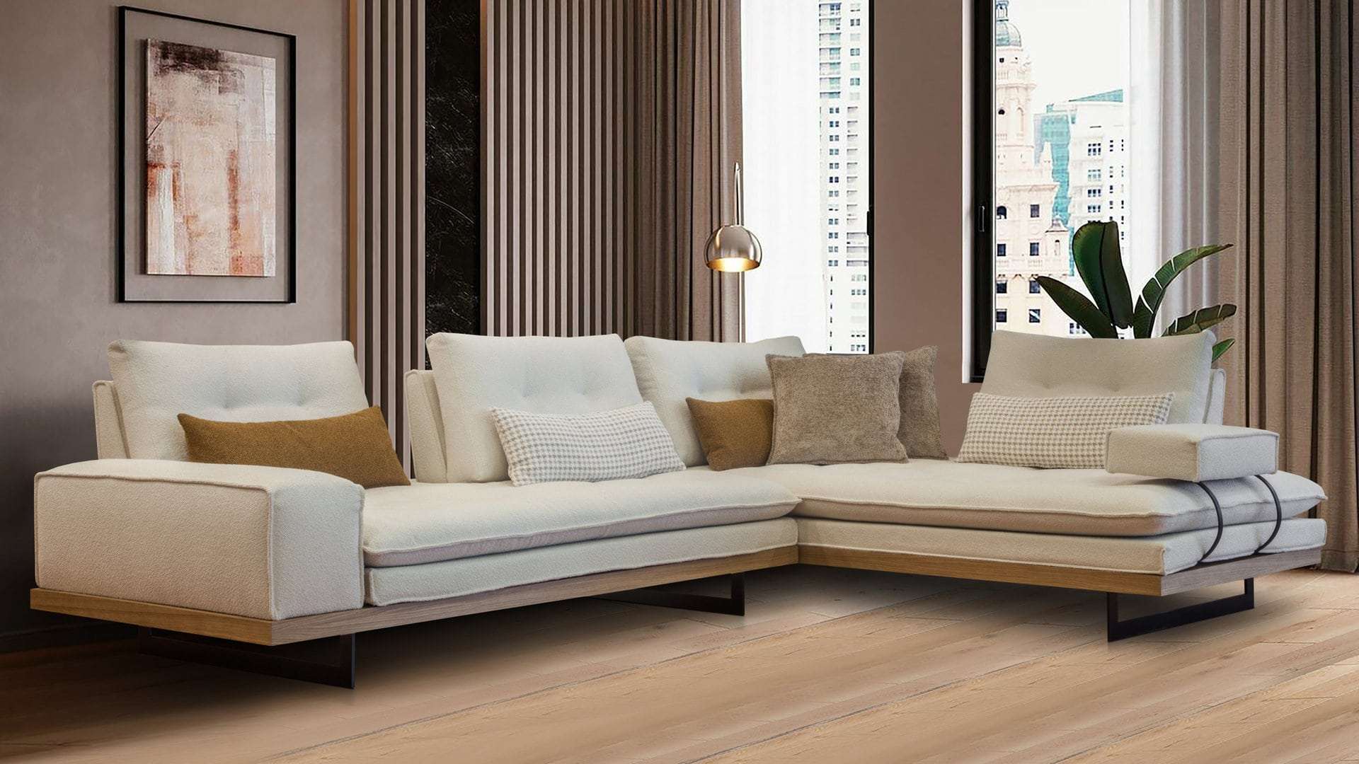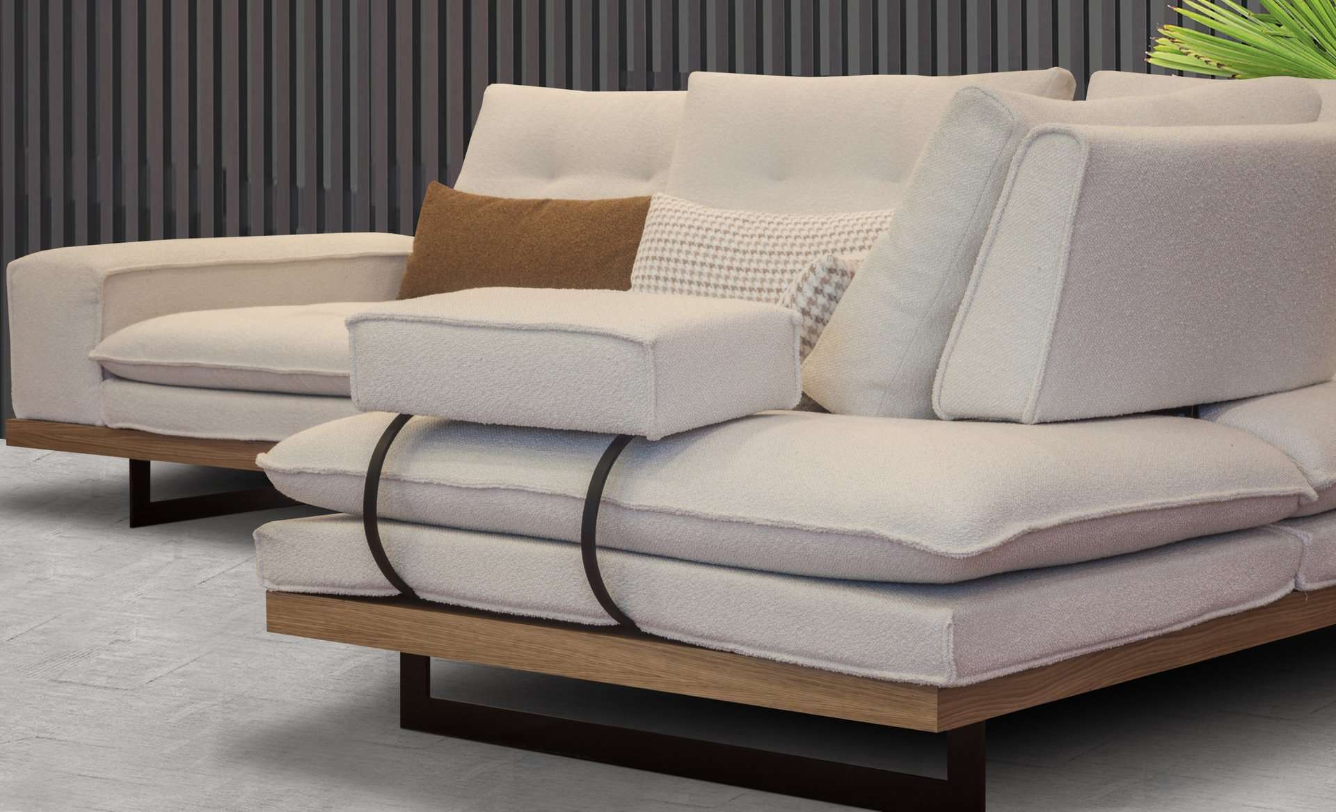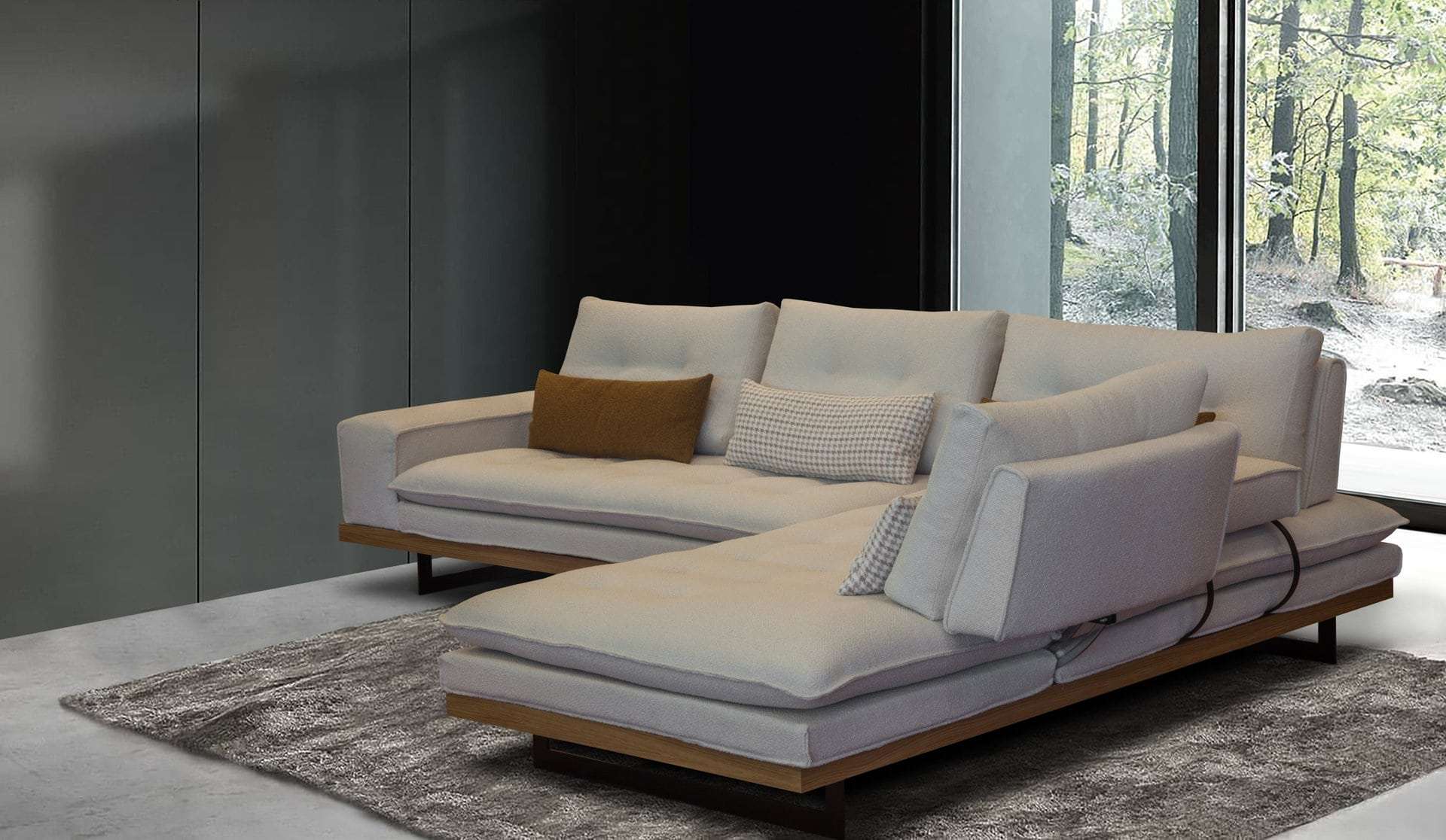 Γωνιακός καναπές 2 τεμαχίων, με λάστιχο υψηλής ποιότητας στο κάθισμα, ξύλινη επένδυση στην μπάζα, ψηλά μεταλλικά πόδια και μηχανισμό στην πλάτη που μας δίνει όλο το βάθος του καναπέ. Διατίθεται σε διάφορες διαστάσεις, με ύφασμα & απόχρωση υφάσματος της επιλογής σας όπως και αποχρώσεις ξύλου.