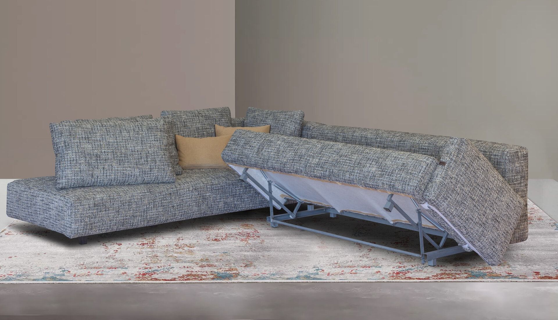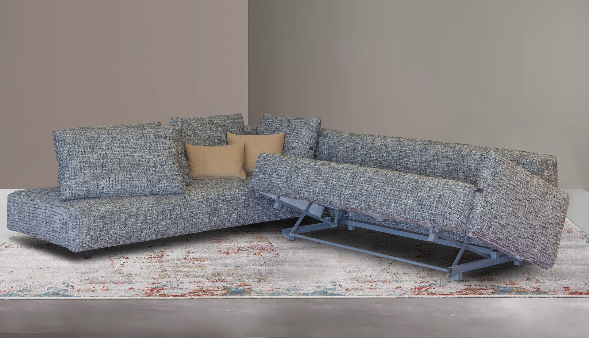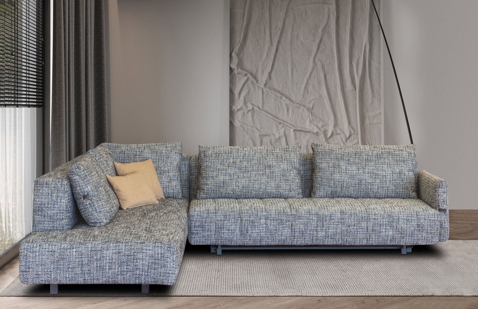 Γωνιακός καναπές 2 τεμαχίων, με μηχανισμό κρεβατιού στην μεγάλη πλευρά. Κατασκευασμένος με λάστιχο υψηλής ποιότητας στο κάθισμα, μοναδικής σχεδίασης. Διατίθεται με ύφασμα & απόχρωση της επιλογής σας.