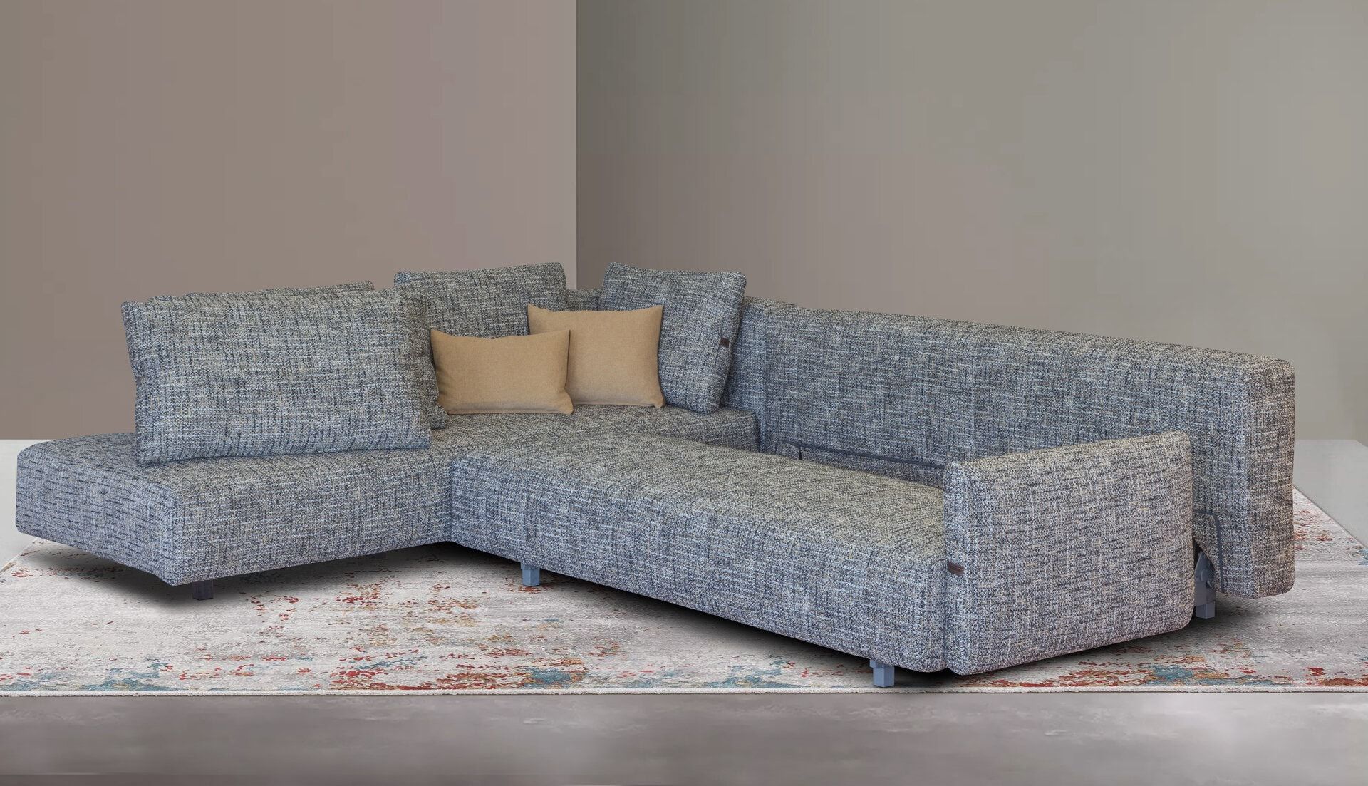 Γωνιακός καναπές 2 τεμαχίων, με μηχανισμό κρεβατιού στην μεγάλη πλευρά. Κατασκευασμένος με λάστιχο υψηλής ποιότητας στο κάθισμα, μοναδικής σχεδίασης. Διατίθεται με ύφασμα & απόχρωση της επιλογής σας.