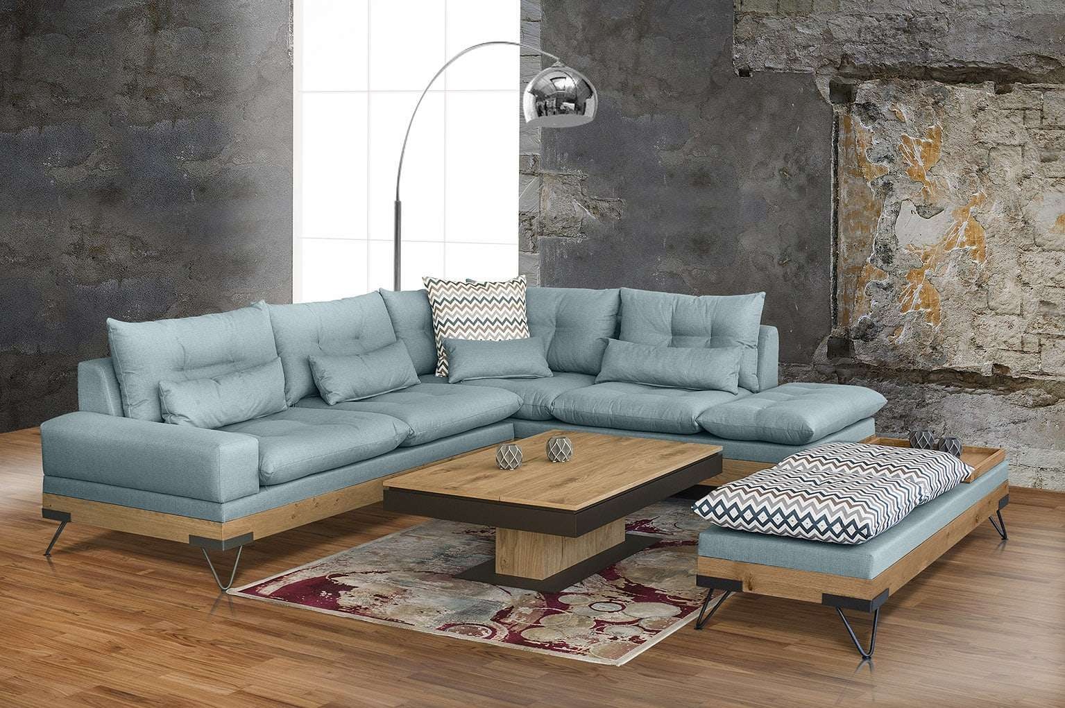 Εντυπωσιακός πολυμορφικός γωνιακός καναπές με εμφανή ξύλινη βάση και μεταλλικά πόδια.
