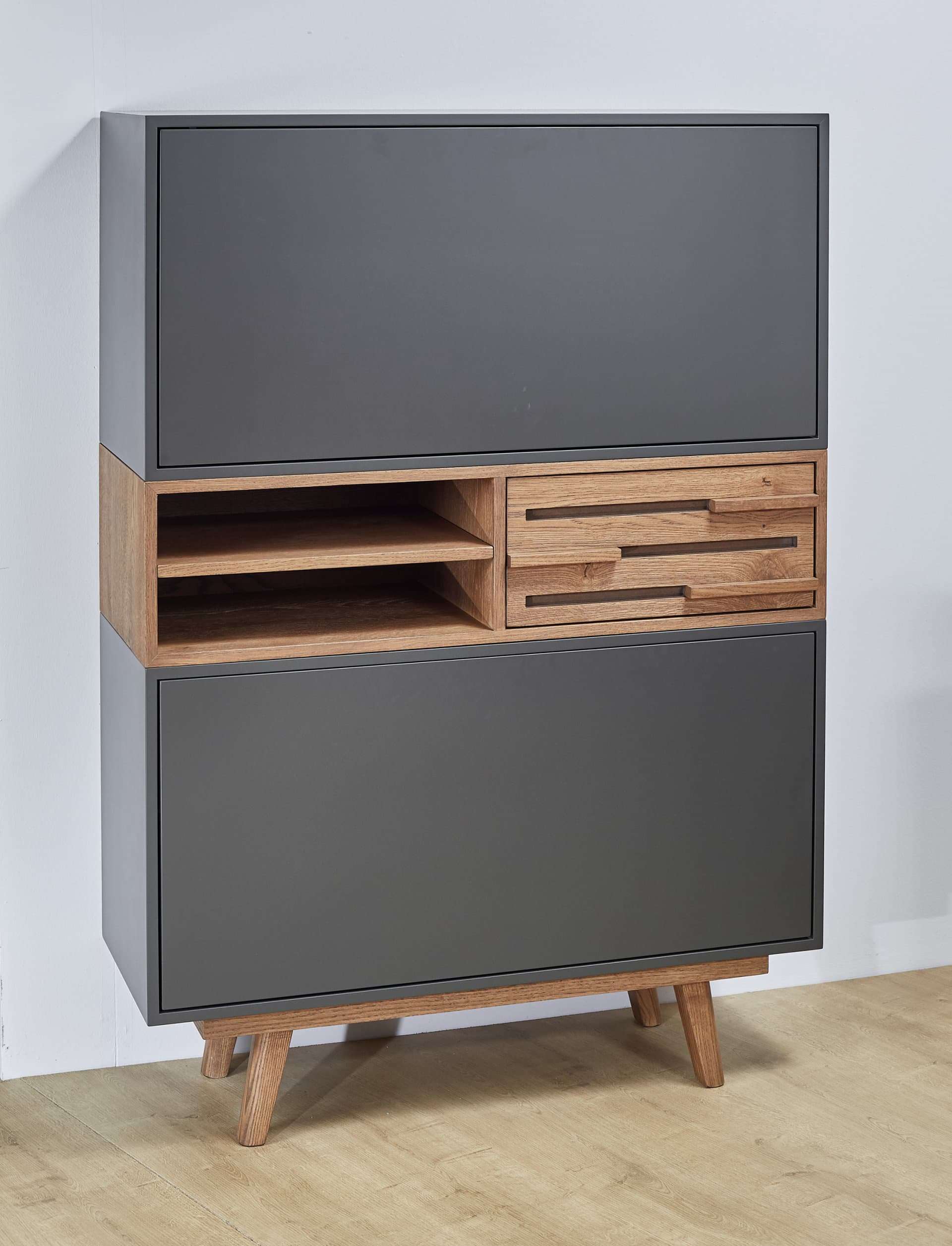 Δρύινος μπουφές κάθετης διάταξης με στοιχεία σε μασίφ ξύλο και λάκα. Δυνατότητα επιλογής χρώματος ξύλου.