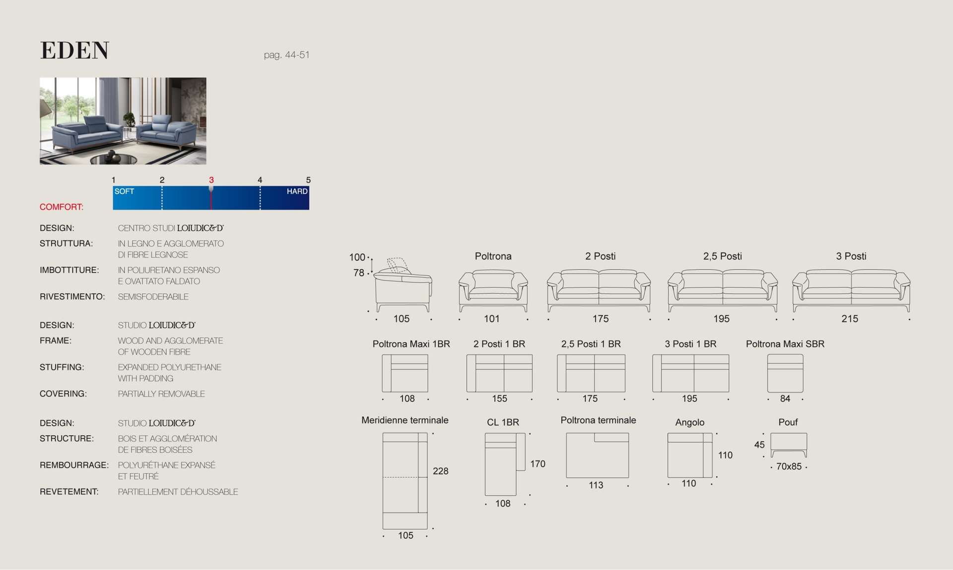Ιταλικός καναπές Eden. Διατίθεται σε γωνιακό, τριθέσιο, διθέσιο και πολυθρόνα. Κατασκευάζεται στην Ιταλία με γνήσιο δέρμα 100% με χρώματα και ποιότητες της επιλογής σας, ή μπορεί να κατασκευαστεί με ύφασμα σε ποιότητα και χρώμα που θα επιλέξετε. Προαιρετική είναι η ξύλινη μπάζα στον καναπέ.