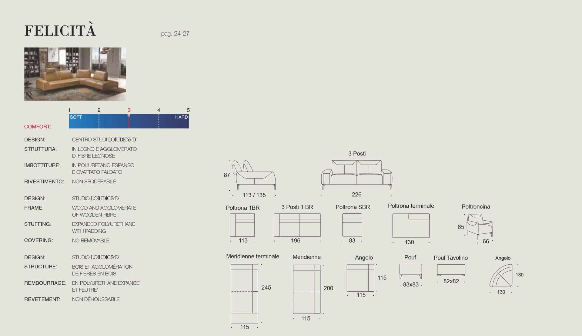 Ιταλικός καναπές Felicita . Διατίθεται σε γωνιακό και τριθέσιο. Κατασκευάζεται στην Ιταλία με γνήσιο δέρμα 100% με χρώματα και ποιότητες της επιλογής σας, ή μπορεί να κατασκευαστεί με ύφασμα σε ποιότητα και χρώμα που θα επιλέξετε. Μηχανισμός ανάκλισης στην πλάτη του καναπέ για μέγιστο βάθος.