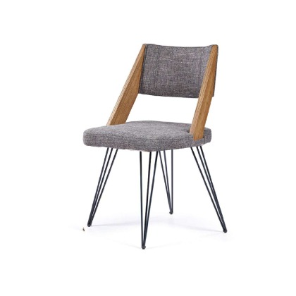 Μοντέρνου σχεδιασμού καρέκλα, ντυμένη με ύφασμα, ξύλινες λεπτομέρειες και μεταλλικά πόδια.