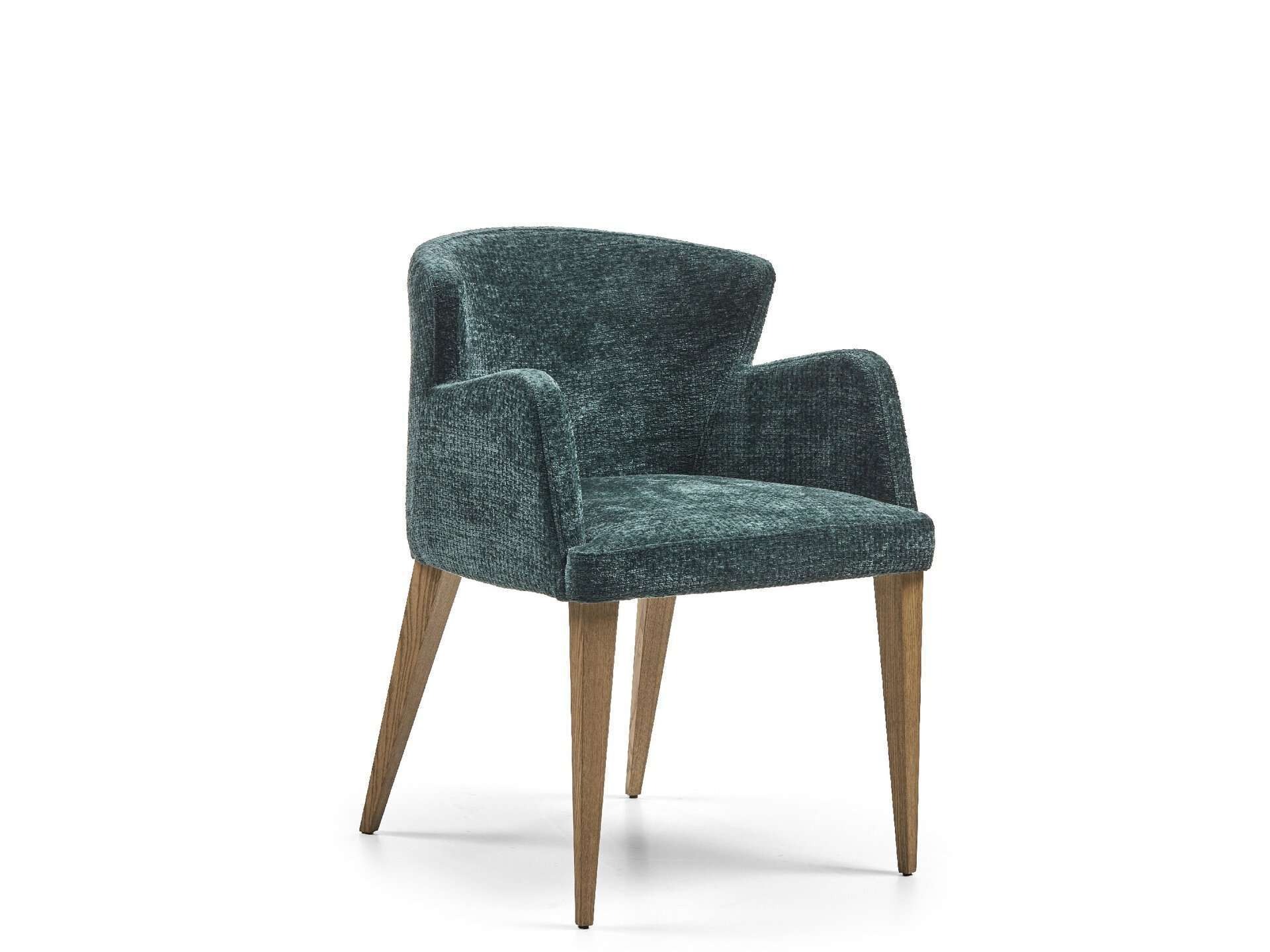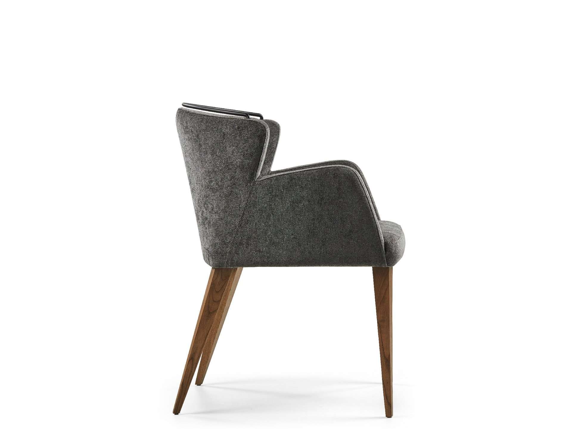 Μοντέρνου σχεδιασμού καρέκλα με μπράτσα, ντυμένη με ύφασμα και ξύλινα πόδια. Δυνατότητα προσθήκης διακοσμητικού μεταλλικού στοιχείου στην πλάτη της καρέκλας.