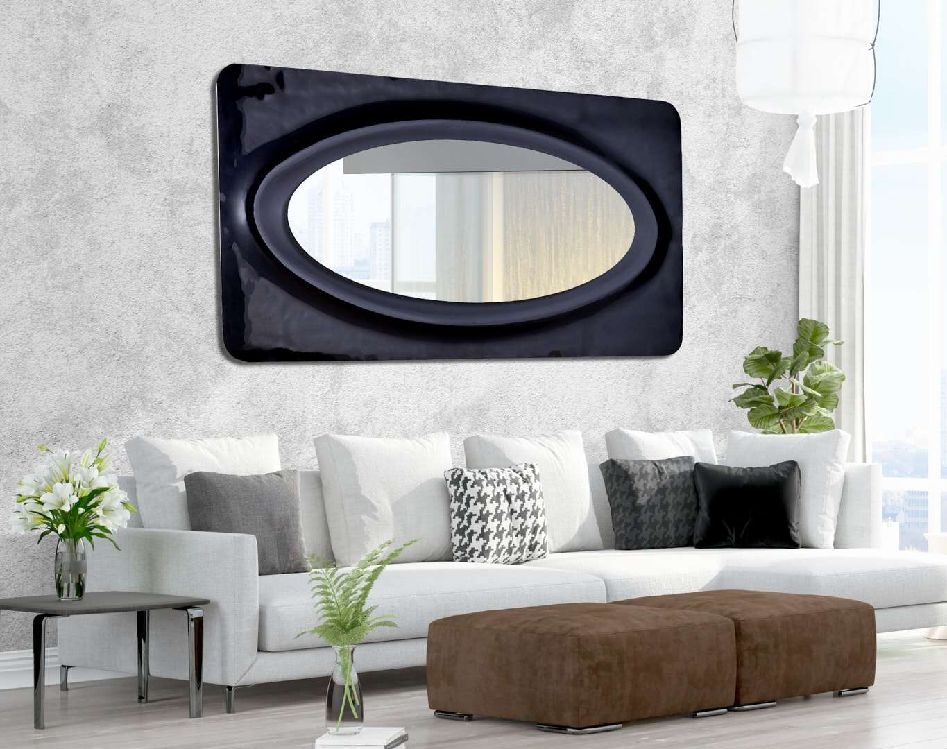Καθρέφτης διακοσμητικός σε σχήμα παραλληλόγραμμο με ιδιαίτερες λεπτομέρειες στο περίγραμμα ψημένου γυαλιού σε μαύρο χρώμα, θα δώσει μια luxury πινελιά στον χώρο σας.