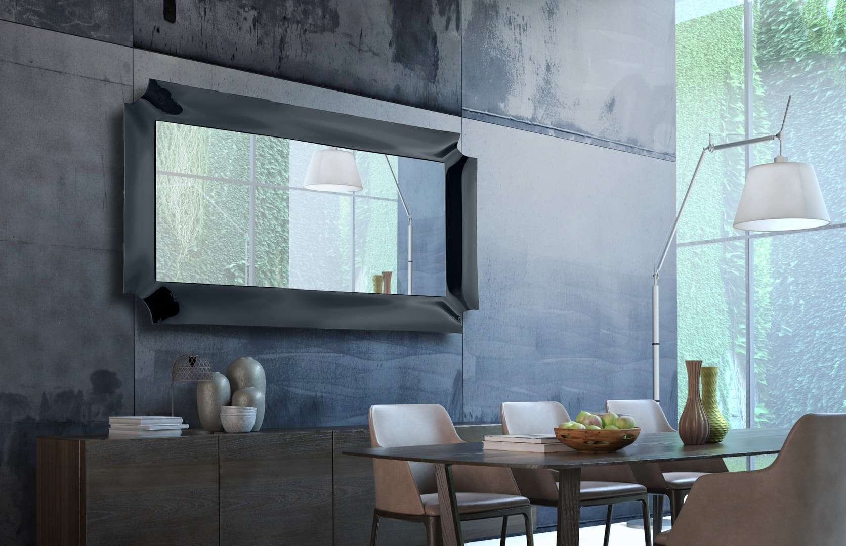 Καθρέφτης διακοσμητικός σε σχήμα παραλληλόγραμμο με ιδιαίτερες λεπτομέρειες στο περίγραμμα ψημένου γυαλιού σε μαύρο χρώμα, θα δώσει μια luxury πινελιά στον χώρο σας.