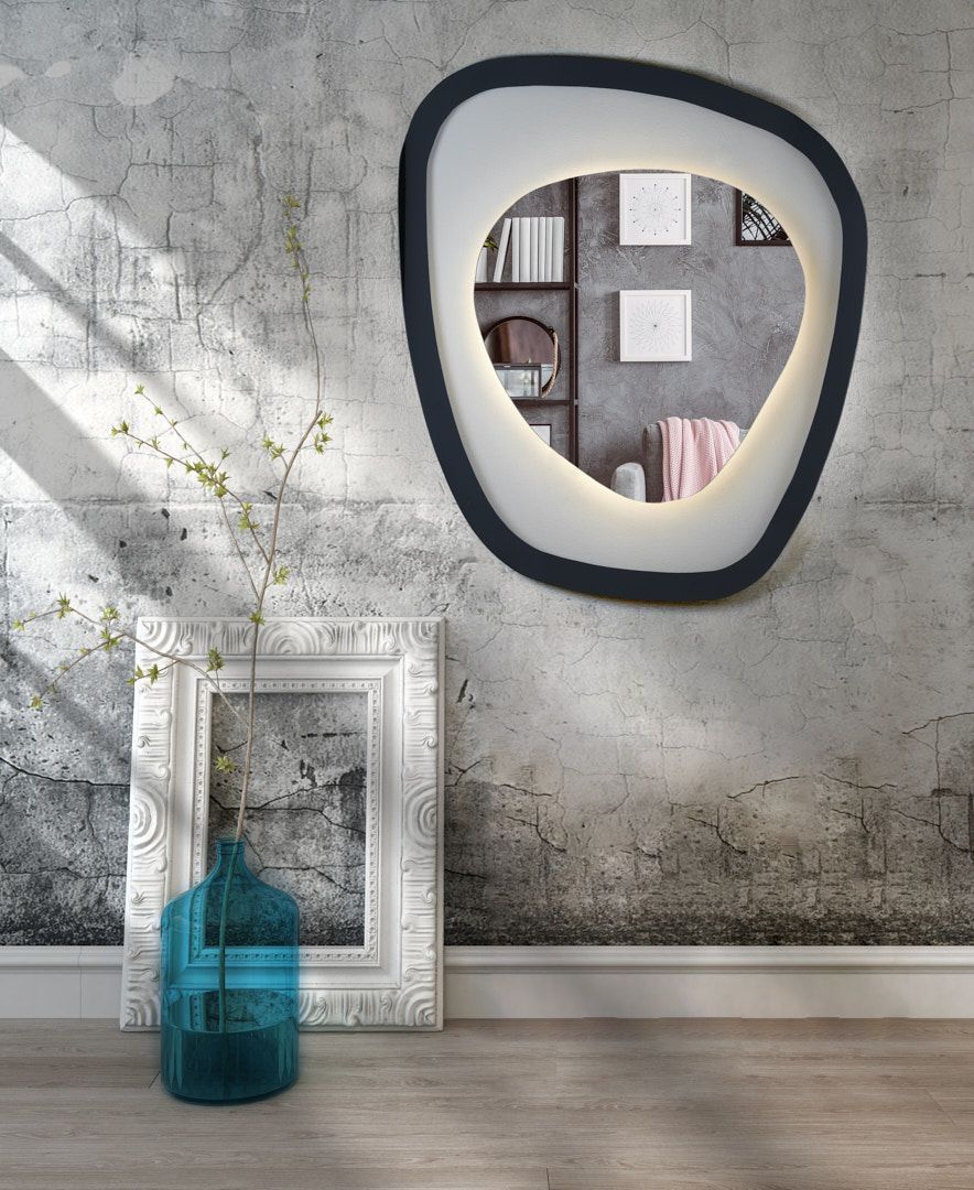 Καθρέφτης ιδιαίτερος σε ακανόνιστο σχήμα και φωτισμό led. Με φυσικό χρώμα κρυστάλλου στο κέντρο και διάφανο κρύσταλλο που μας επιτρέπει να βλέπουμε πίσω απο αυτόν.