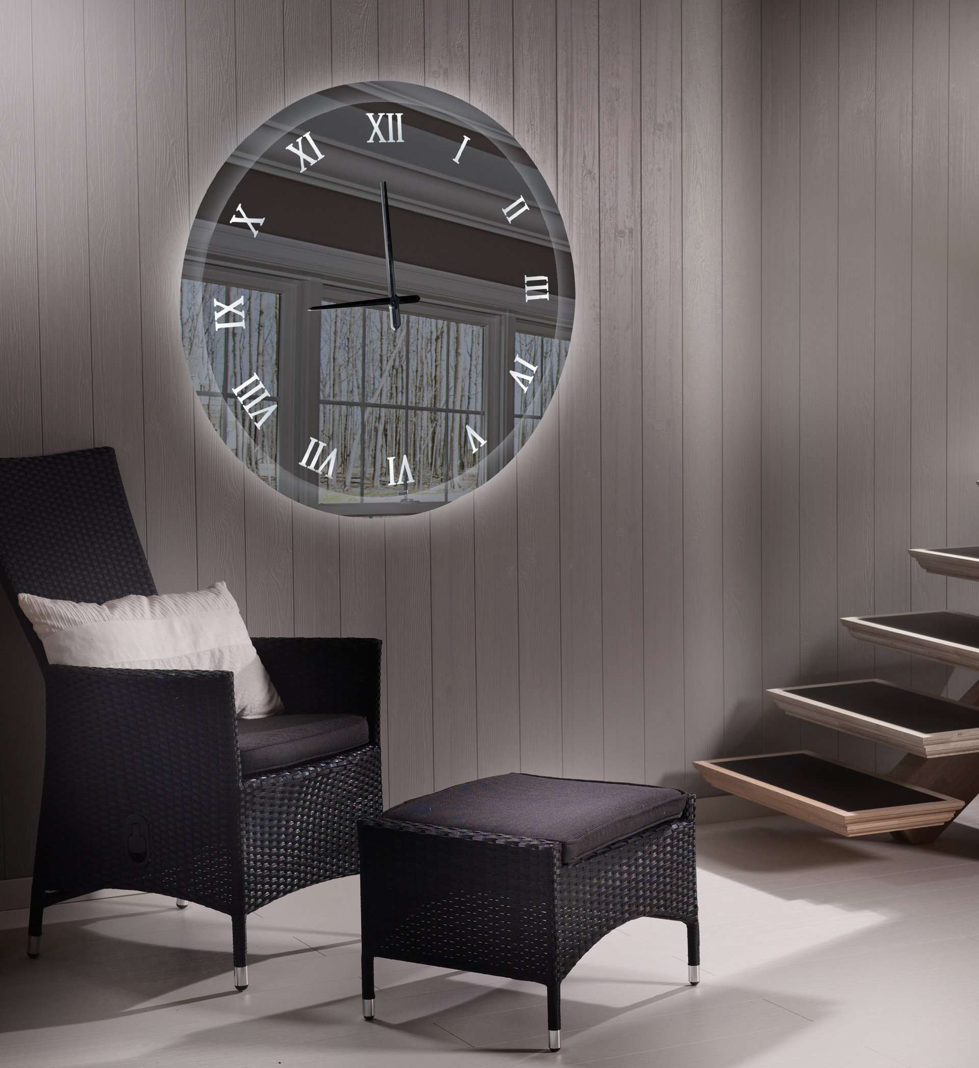 Καθρέφτης ρολόι με φωτισμό led, με αμμοβολή στα λατινικά νούμερα και καθρέφτη φιμέ. Όταν είναι κλειστός ο φωτισμός φαίνεται σας ένας απλός καθρέπτης.
