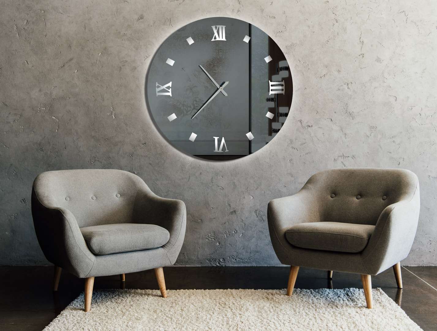 Καθρέφτης ρολόι με φωτισμό led, με αμμοβολή στα λατινικά νούμερα και καθρέφτη φιμέ. Όταν είναι κλειστός ο φωτισμός φαίνεται σας ένας απλός καθρέπτης.