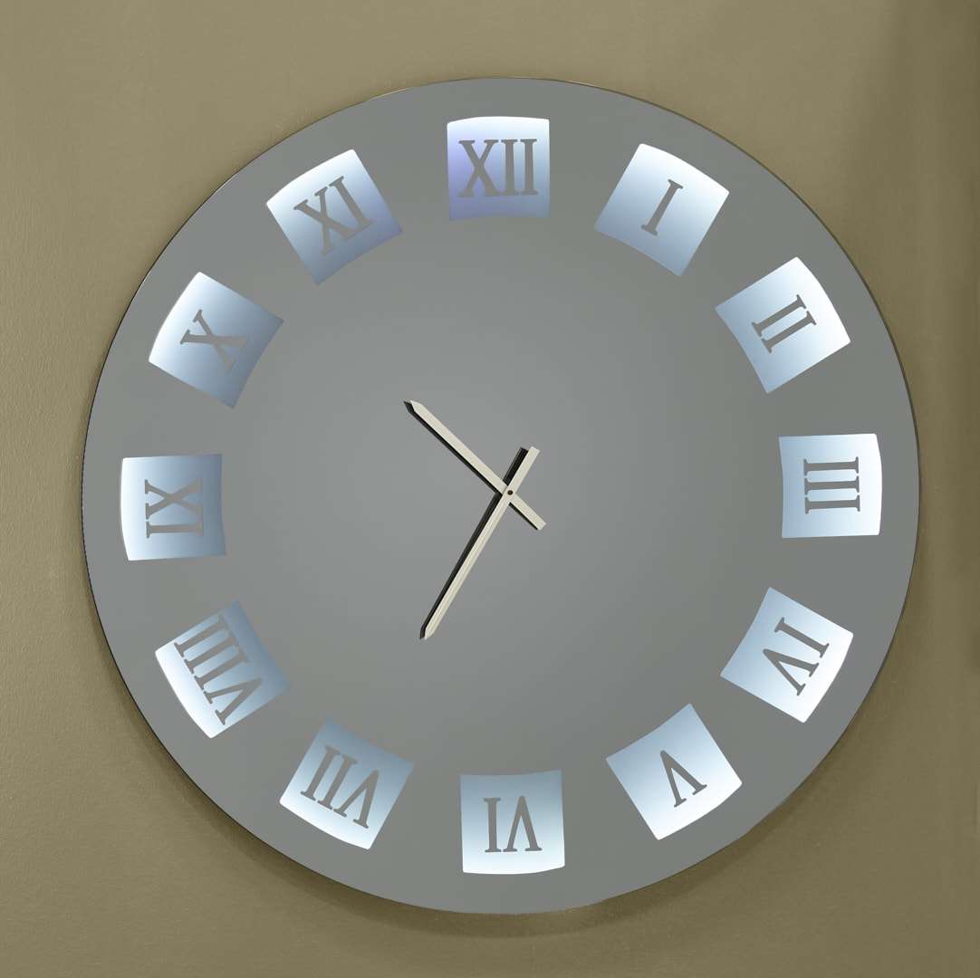 Καθρέφτης ρολόι με φωτισμό led, με αμμοβολή στα λατινικά νούμερα και  χρώμα καθρέφτη φιμέ.