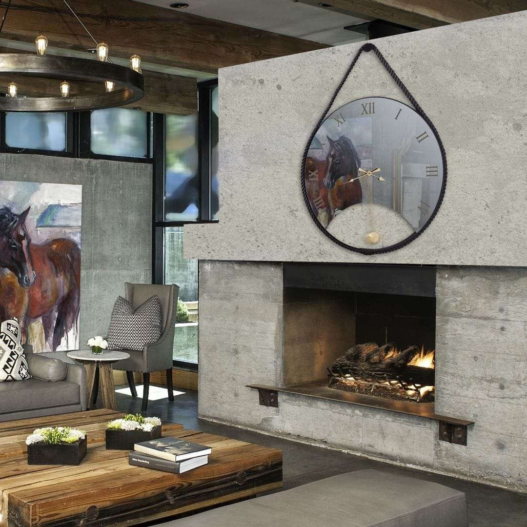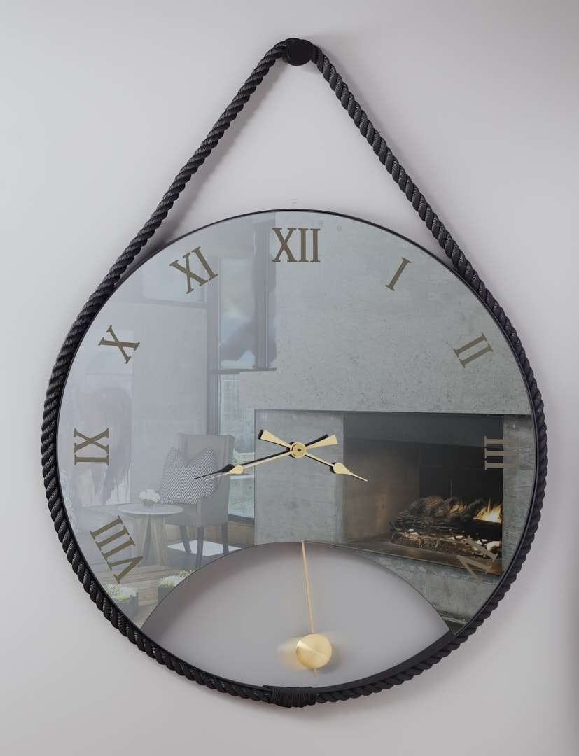 Καθρέφτης ρολόι με περιμετρικό μέταλλο. Επιπλέον διαθέτει μοναδική σχεδίαση και σχοινί περιμετρικά και έχτρα μηχανισμό εκκρεμές από το οποίο τοποθετείται στον τοίχο.