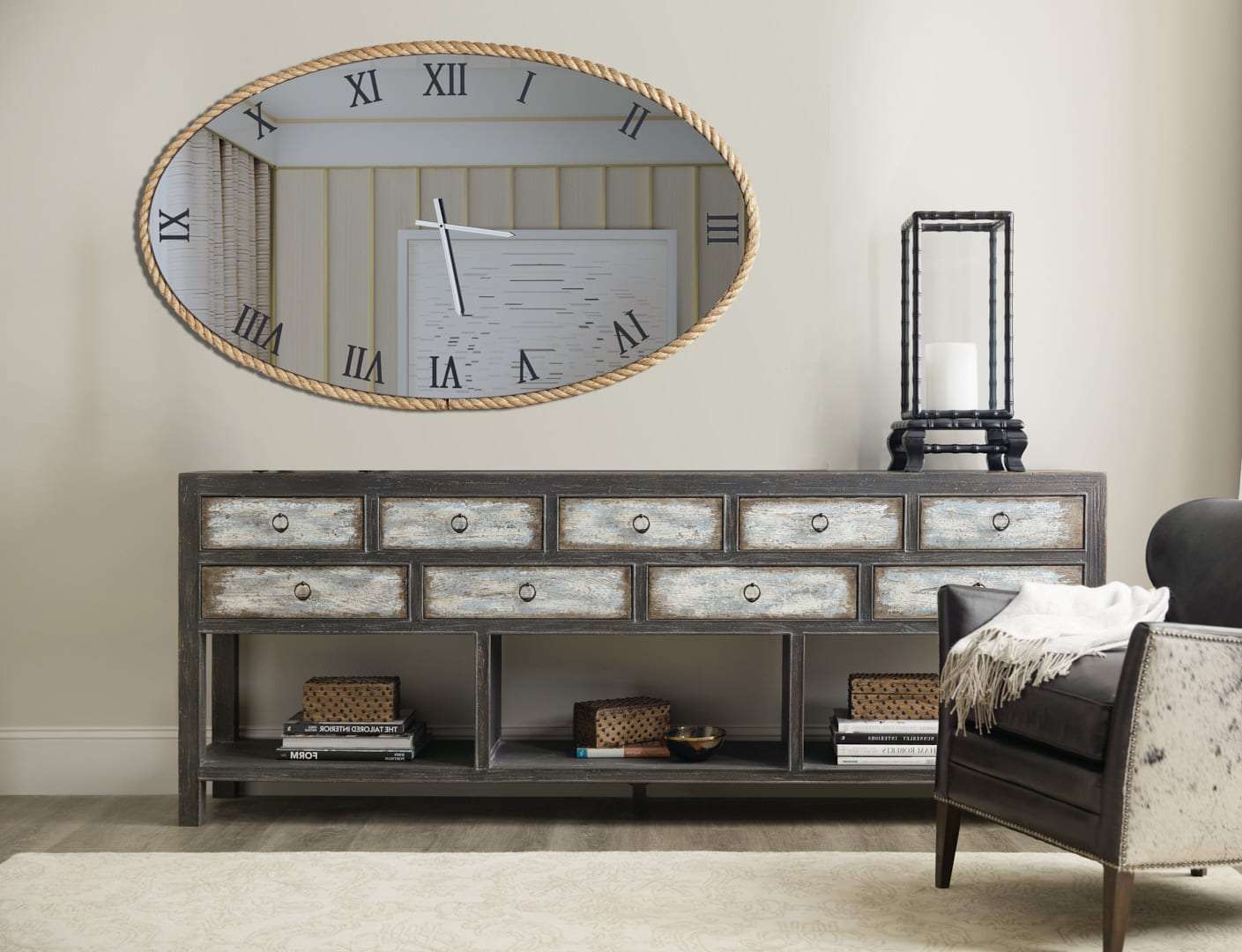 Καθρέφτης ρολόι με περιμετρικό μέταλλο. Επιπλέον διαθέτει μοναδική σχεδίαση και σχοινί περιμετρικά από το οποίο τοποθετείται στον τοίχο.