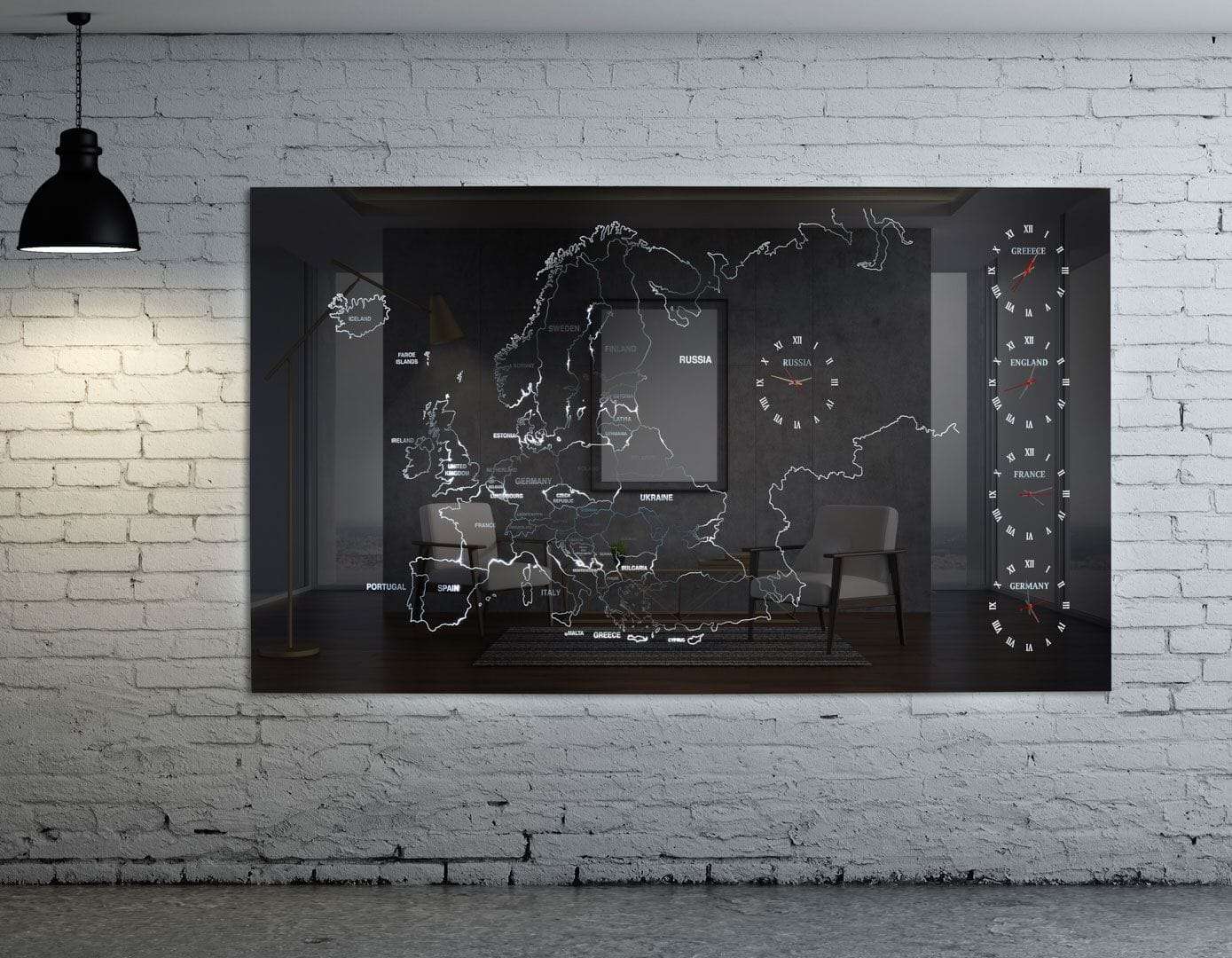 Καθρέφτης ρολόι με φωτισμό led, με πέντε μηχανισμούς για να μπορείτε να ορίσετε διαφορετικές ώρες κάθε χώρας. Μπορείτε να επιλέξετε και ποιες χώρες θέλετε να γράψουμε. Με μια μικρή χρεώσει μπορούμε να βάλουμε στον καθρέπτη και το λογότυπο της εταιρείας σας. Το μοτίβο του καθρέφτη απεικονίζει το μεγαλύτερο μέρος του χάρτη της Ευρώπης.