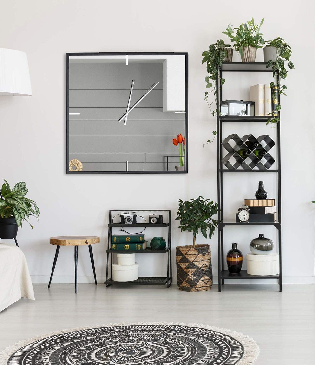 Καθρέφτης ρολόι με περιμετρικό μέταλλο. Επιπλέον διαθέτει μοναδική σχεδίαση με φυσικό χρώμα καθρέφτη το οποίο τοποθετείται στον τοίχο.