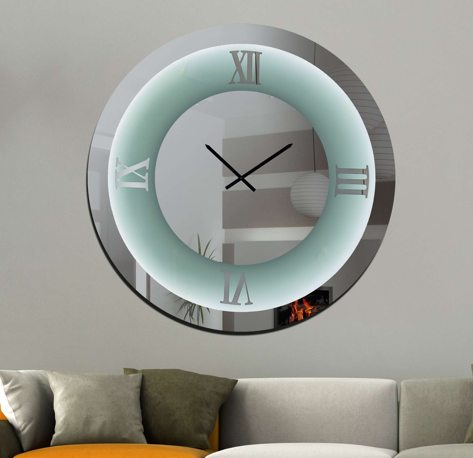 Καθρέφτης ρολόι με φωτισμό led, με αμμοβολή στα λατινικά νούμερα και χρώμα καθρέφτη φιμέ.
