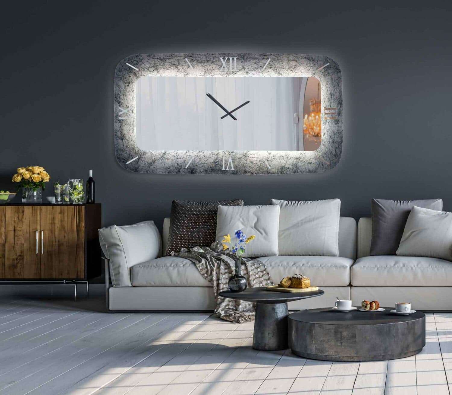 Καθρέφτης ρολόι με φωτισμό led, με αμμοβολή στα λατινικά νούμερα και  χρώμα καθρέφτη φιμέ.