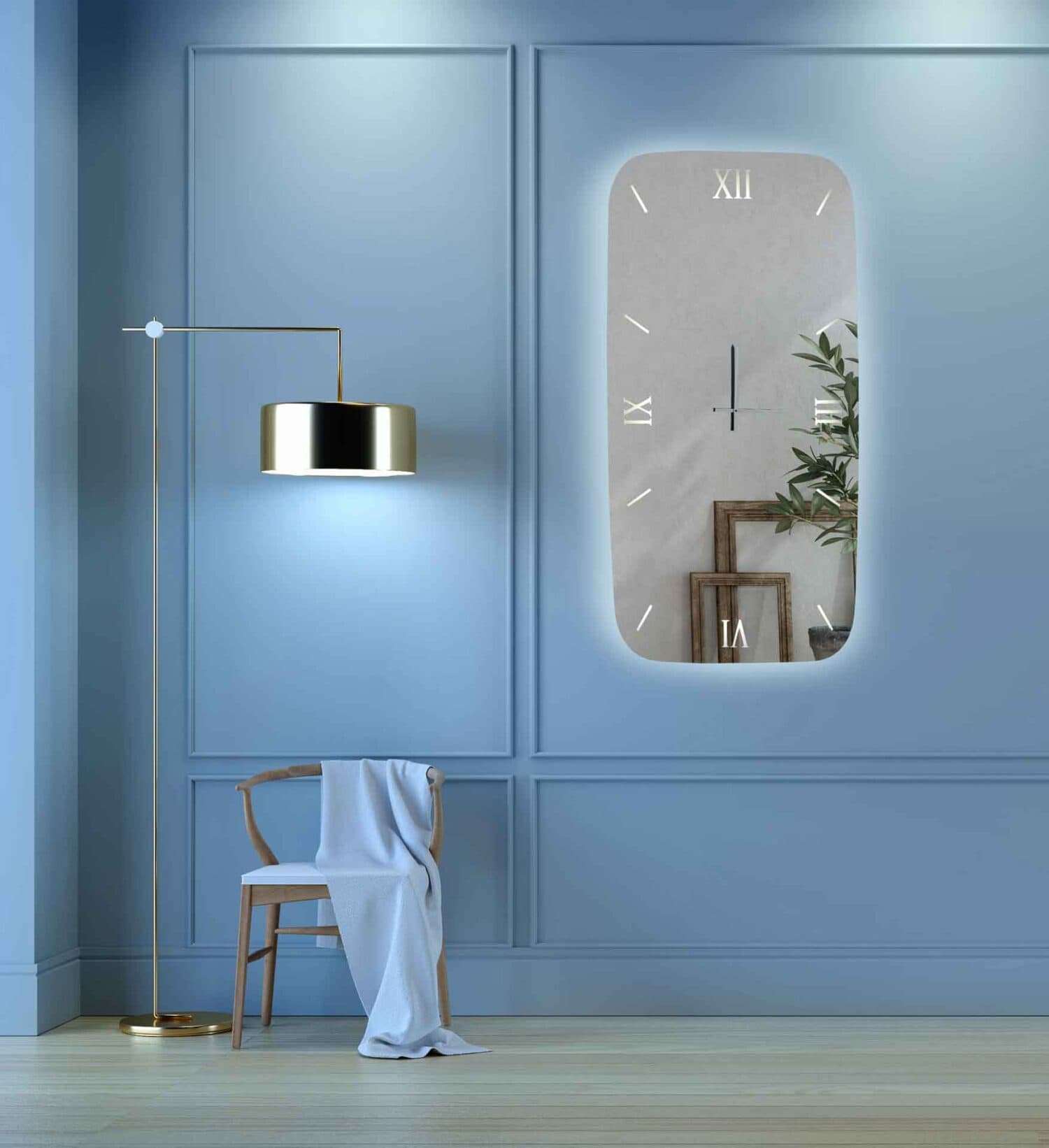 Καθρέφτης ρολόι με φωτισμό led, με αμμοβολή στα λατινικά νούμερα και  χρώμα καθρέφτη φιμέ.