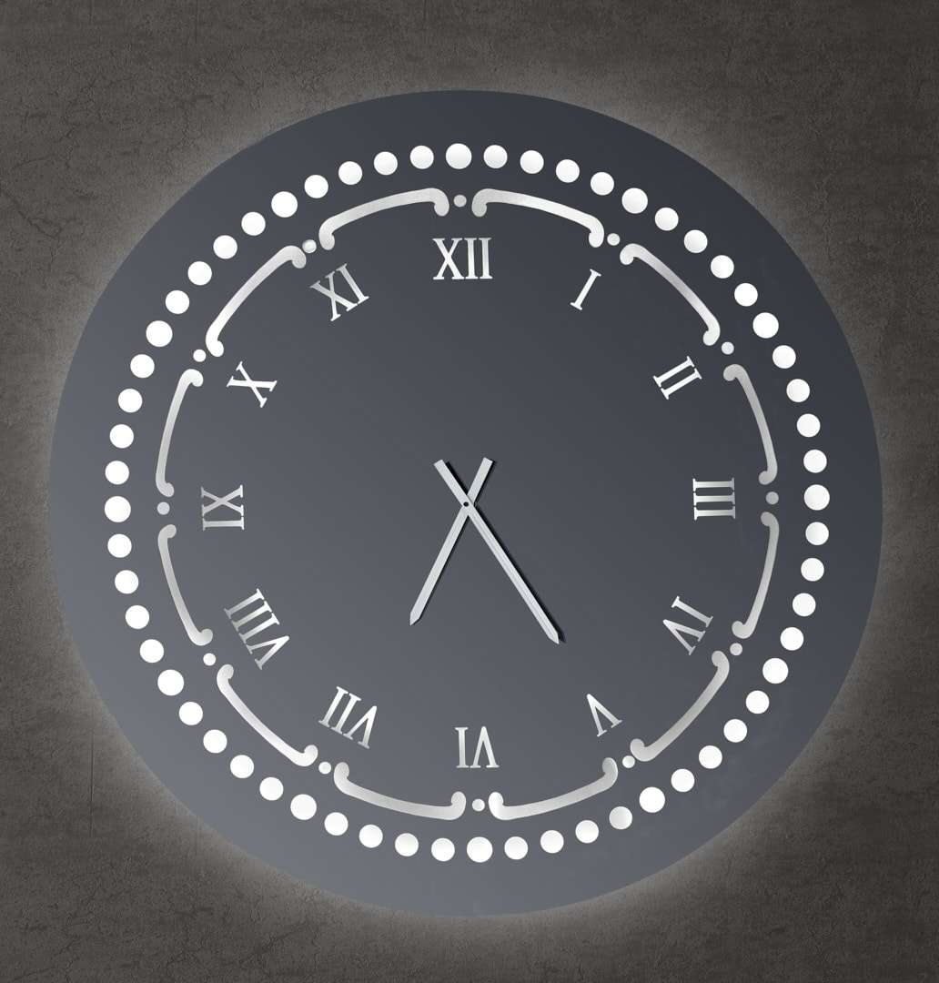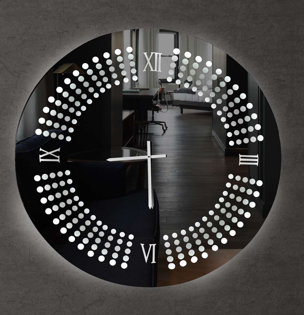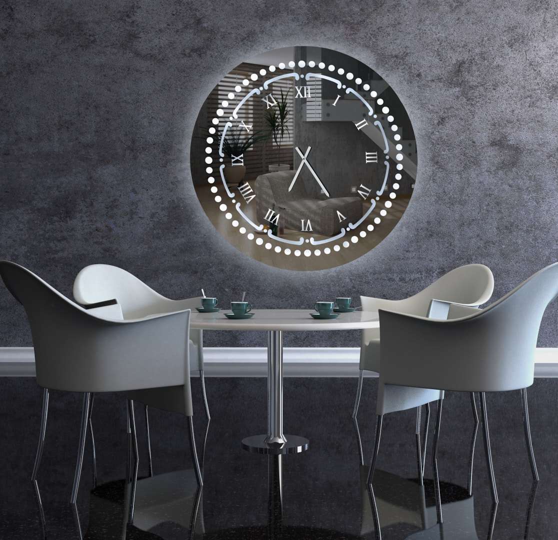 Καθρέφτης ρολόι με φωτισμό led, με αμμοβολή στα λατινικά νούμερα και  χρώμα καθρέφτη φιμέ.