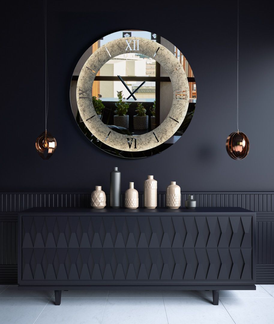 Καθρέφτης ρολόι με φωτισμό led, με αμμοβολή στα λατινικά νούμερα και  χρώμα καθρέφτη φιμέ.