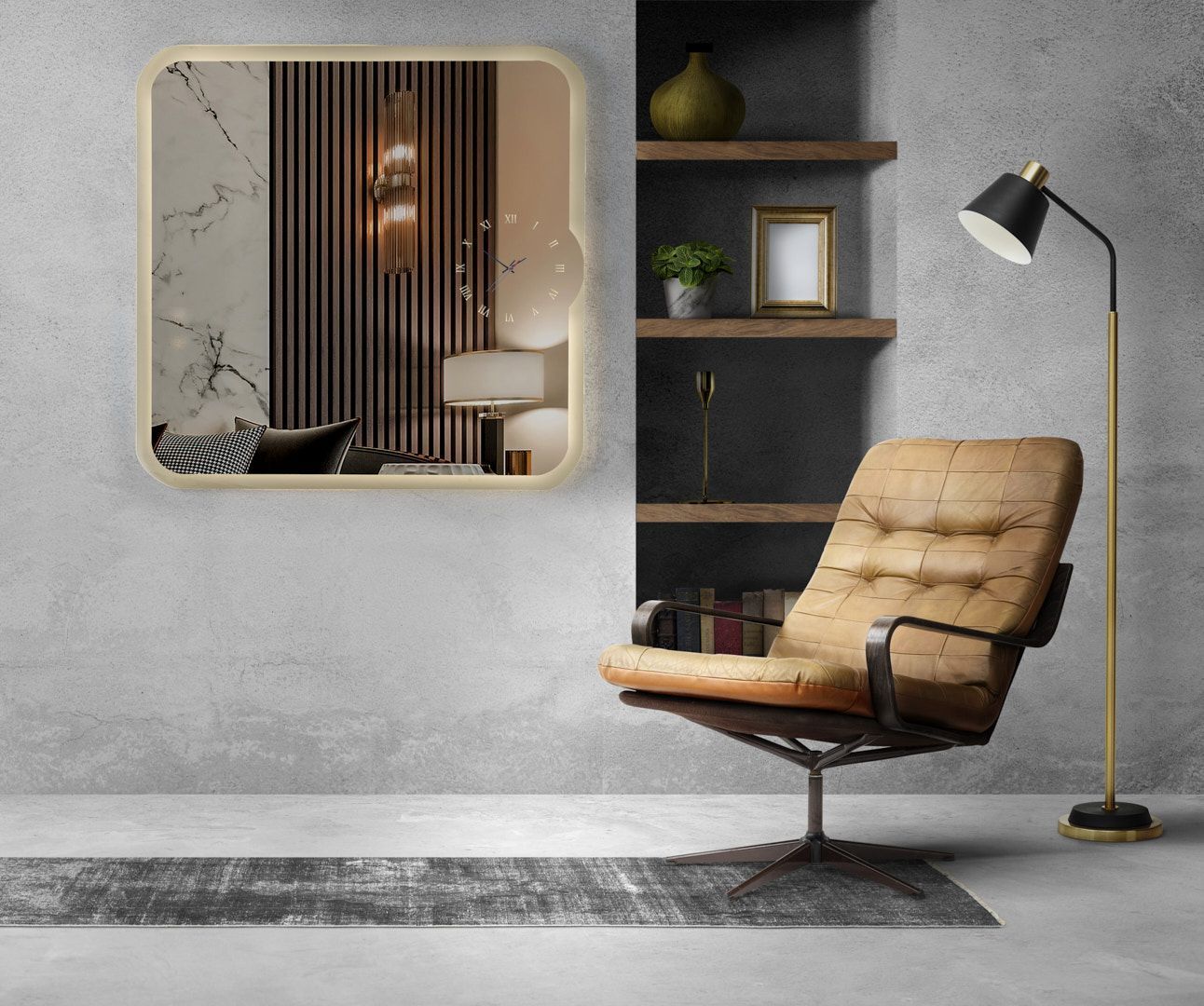 Καθρέφτης ρολόι με φωτισμό led. Τετράγωνος φιμέ καθρέπτης με αμμοβολή και λατινικά νούμερα.