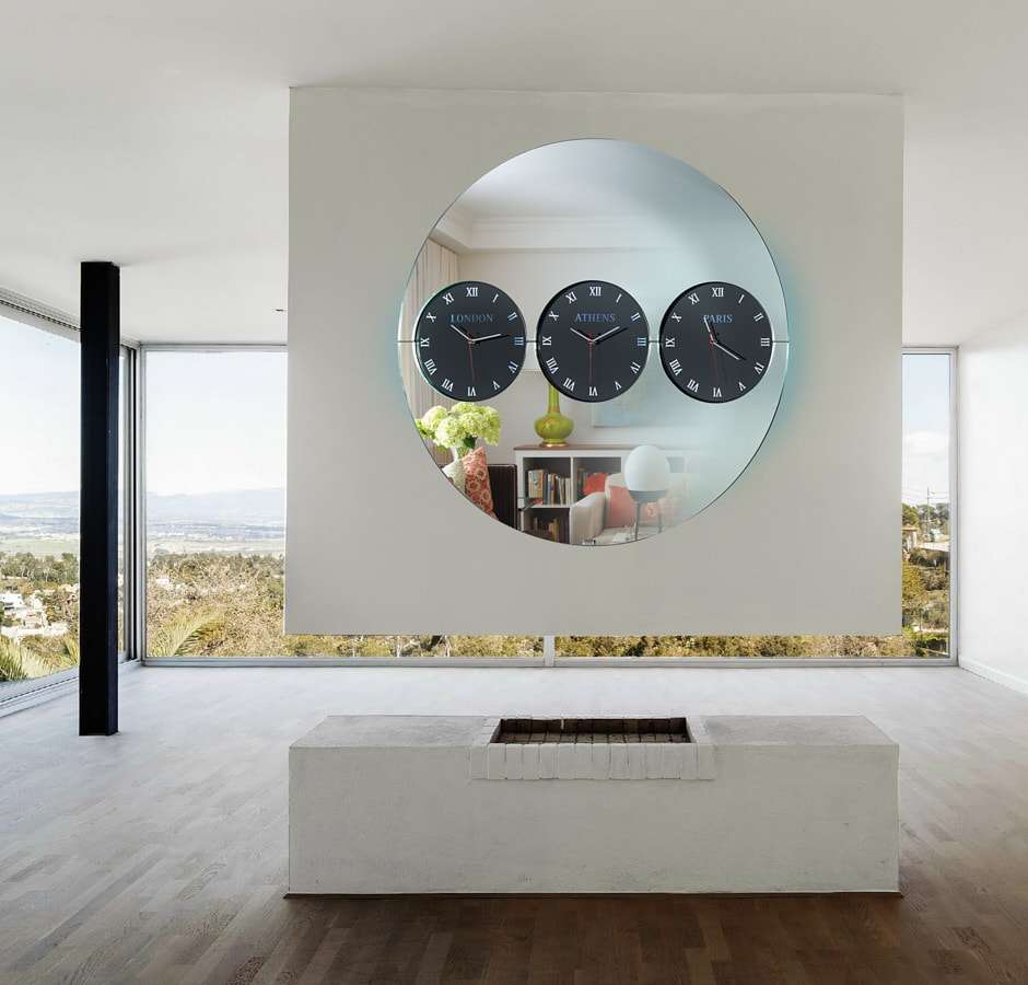Καθρέφτης ρολόι με φωτισμό led, με τρείς μηχανισμούς για να μπορείτε να ορίσετε διαφορετικές ώρες κάθε χώρας. Μπορείτε να επιλέξετε και ποιες χώρες θέλετε να γράψουμε.