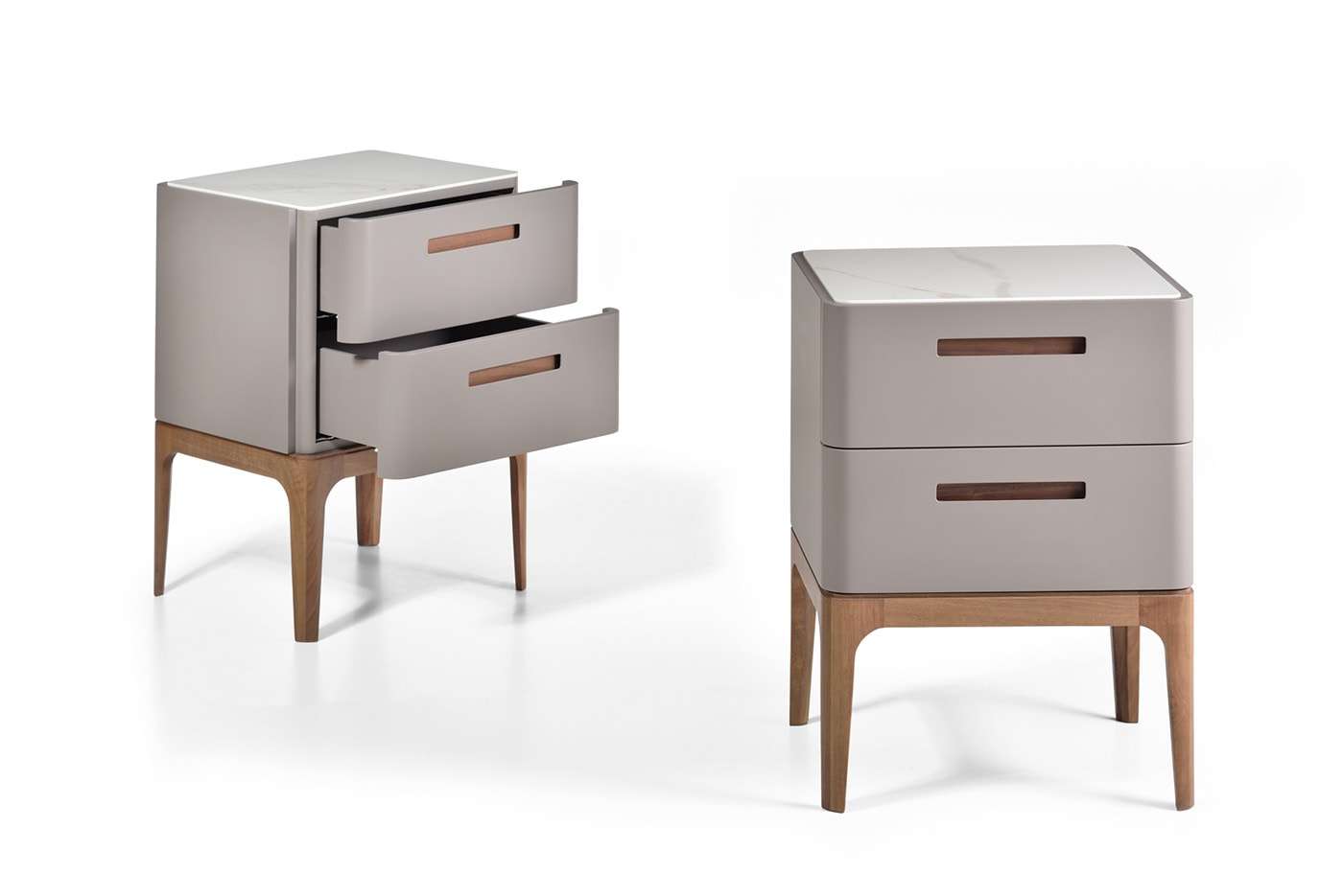 Κομοδίνο με συρτάρια σε λάκα, πλαίσιο βάσης από μασίφ ξύλο και χερούλια με λεπτομέρεια από καπλαμά.