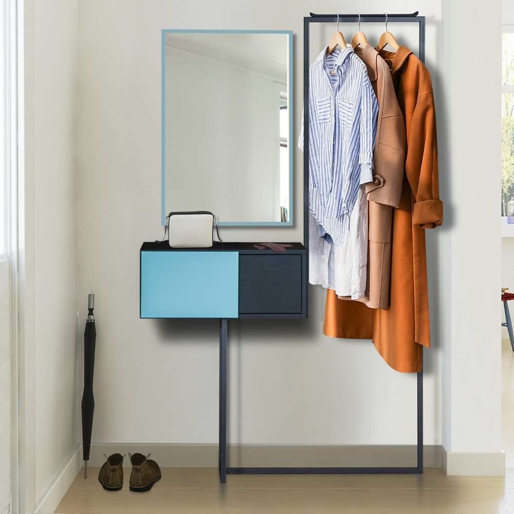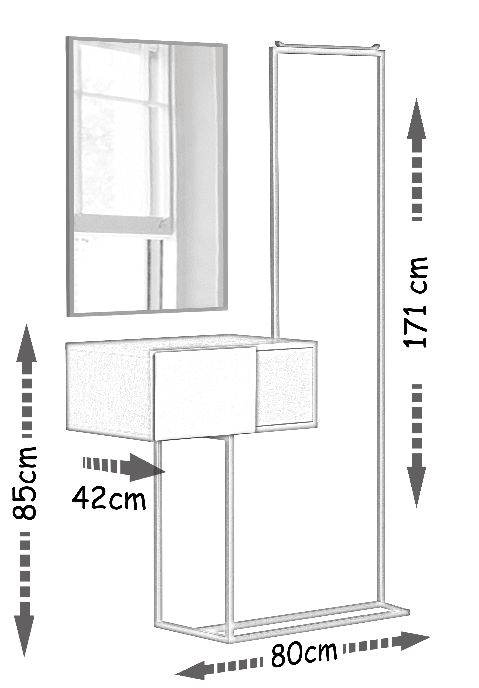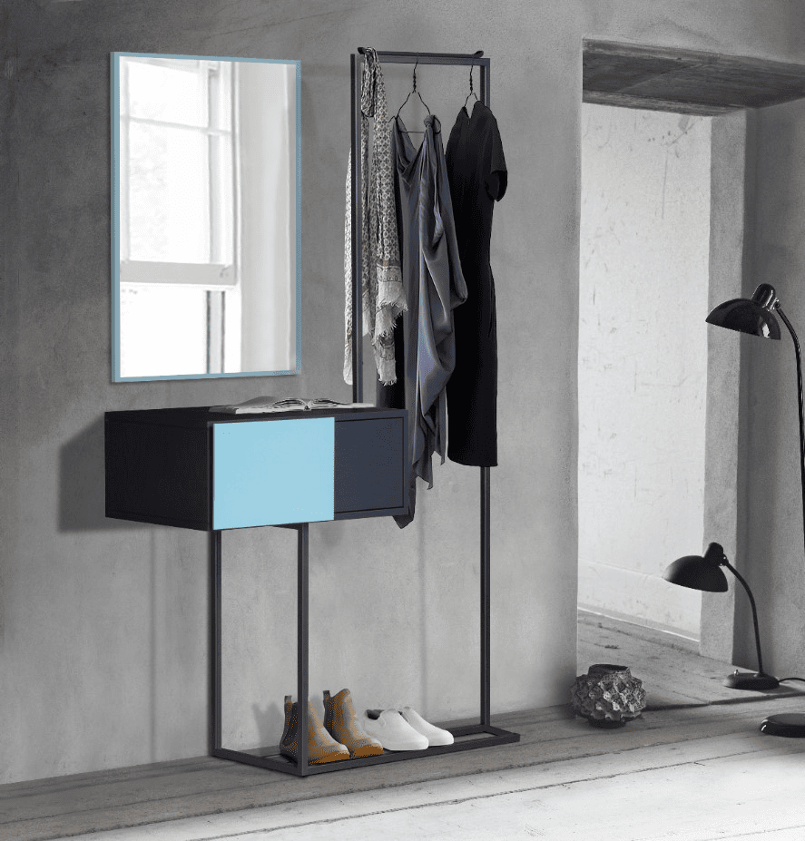 Μια ξεχωριστή κονσόλα με μεταλλικό σκελετό, συρτάρι, καθρέφτη, χώρο για τα παπούτσια και ξύλινη κρεμάστρα. Τα μπουφάν, τα παπούτσια και τα αντικείμενα που κρατάτε όταν μπαίνετε σπίτι, βρίσκουν τη θέση τους, δίνοντας σας χρόνο να φύγετε στην ώρα σας, χωρίς περιττό ψάξιμο… Και φεύγοντας η τελική ματιά στον καθρέφτη τονώνει την αυτοπεποίθηση σας.