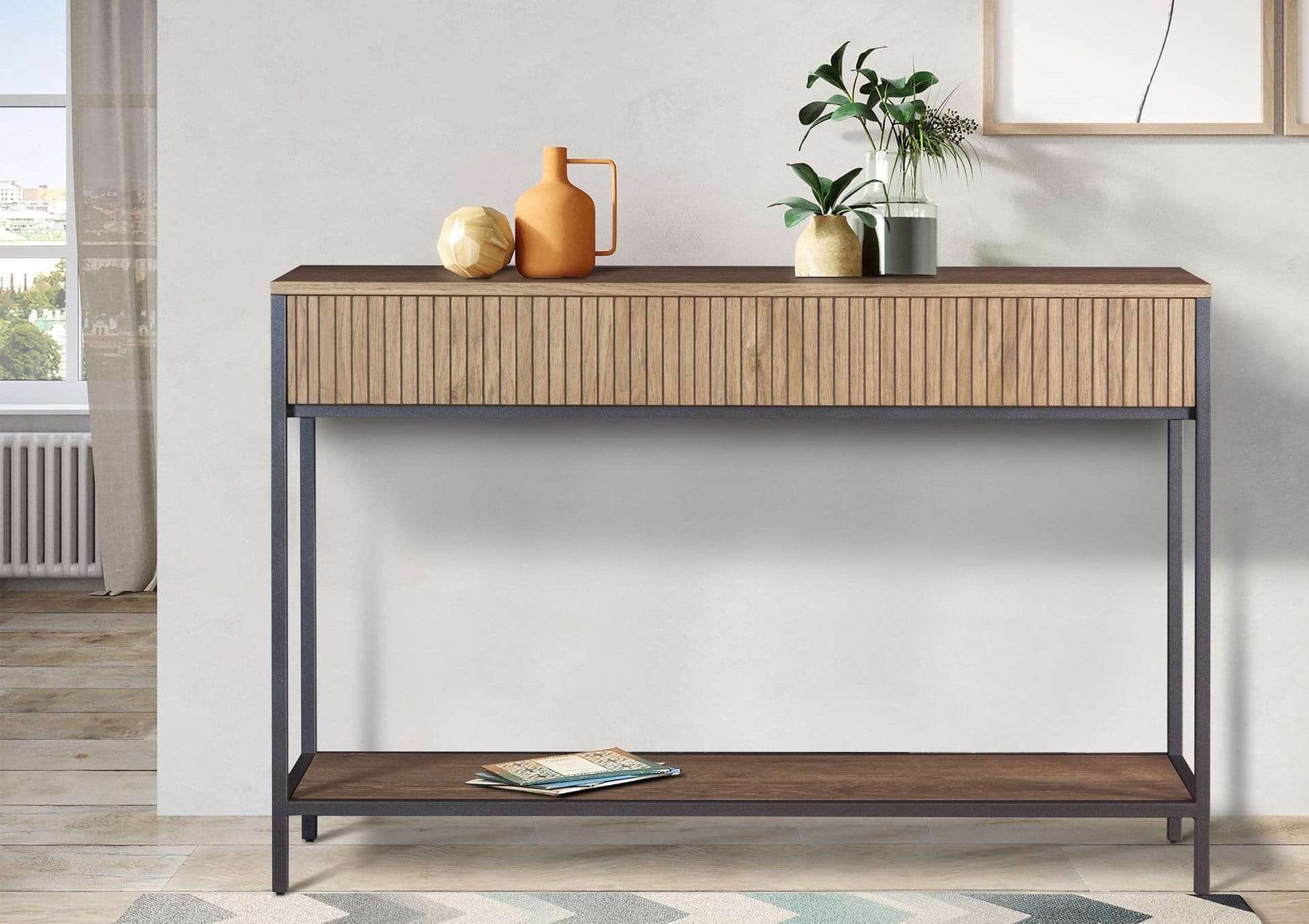 Κονσόλα Smooth. Ξύλο δρυ ρουστίκ, λάκα και μεταλλική βάση, με ένα ευρύχωρο συρτάρι.