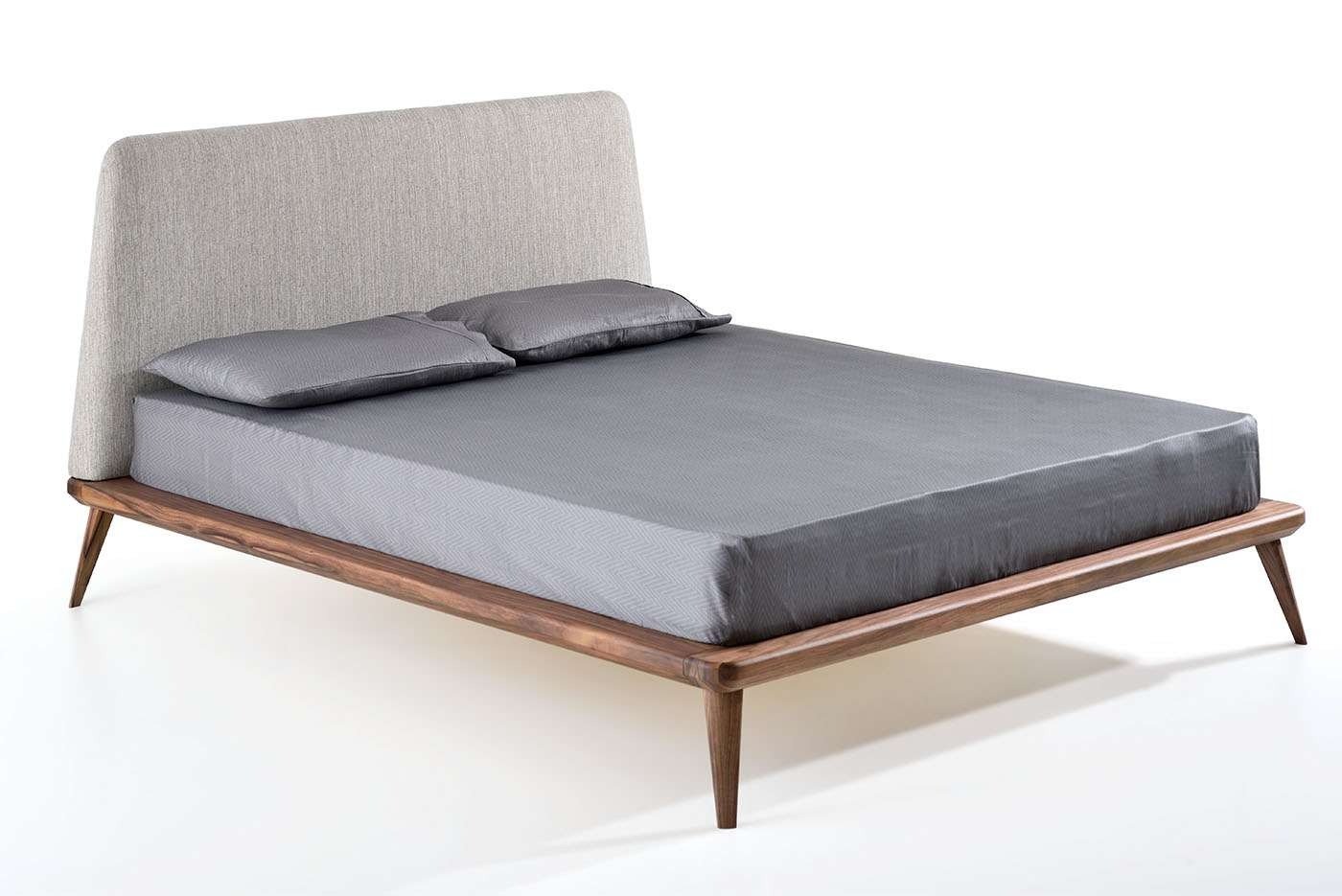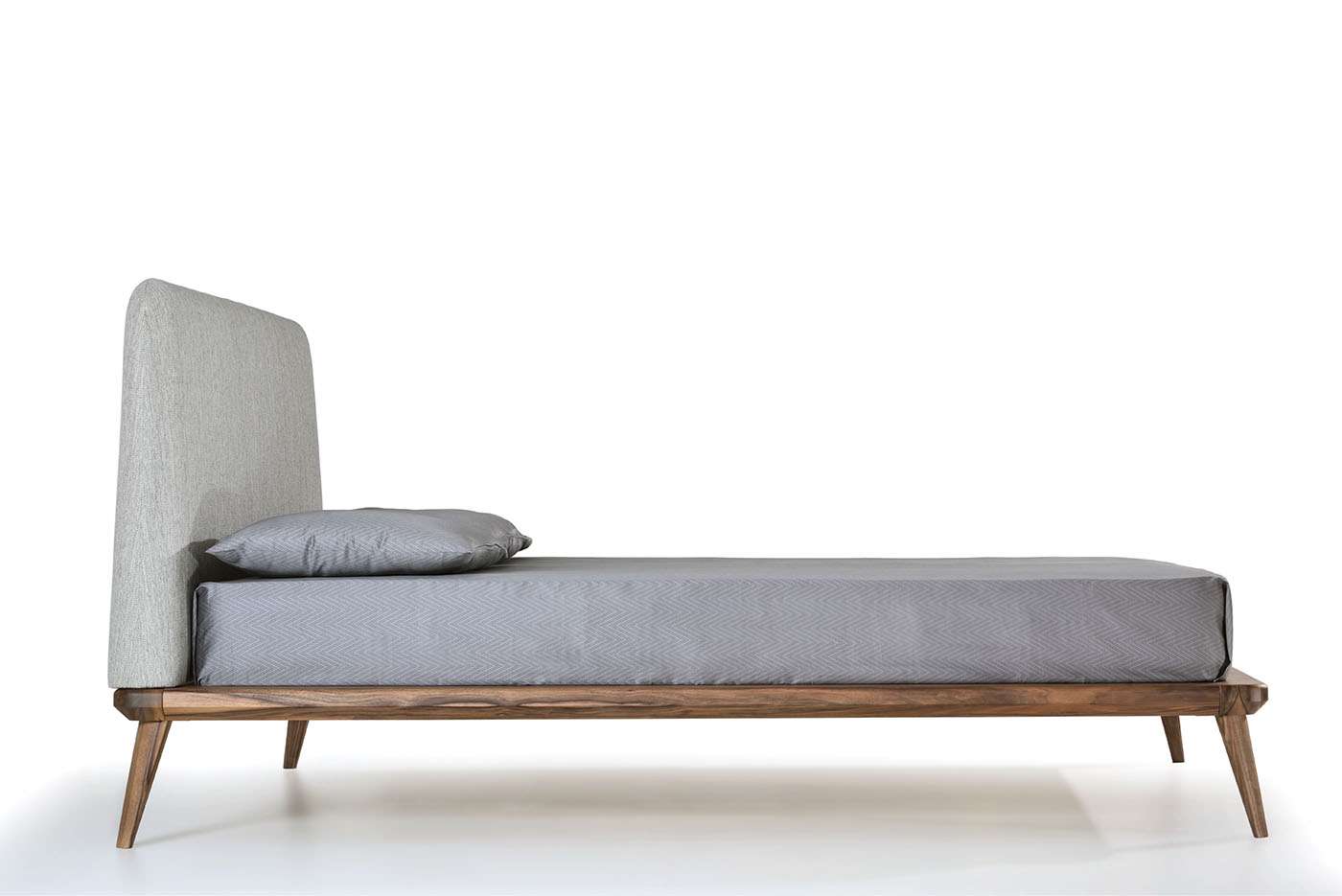 Κρεβάτι με σκελετό από μασίφ ξύλο, καμπύλες άκρες και επένδυση που μειώνει το πάχος και το πλάτος από κάτω προς τα πάνω.