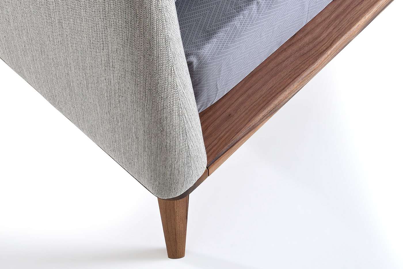 Κρεβάτι με σκελετό από μασίφ ξύλο, καμπύλες άκρες και επένδυση που μειώνει το πάχος και το πλάτος από κάτω προς τα πάνω.