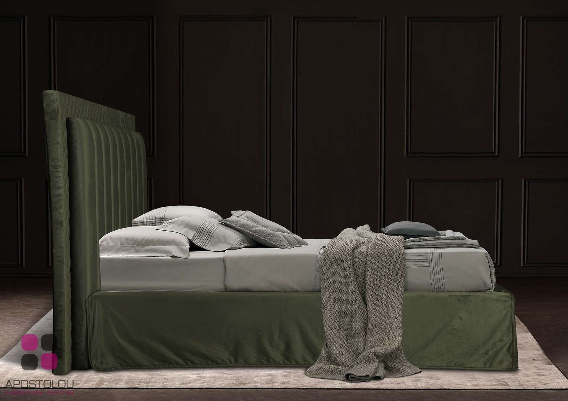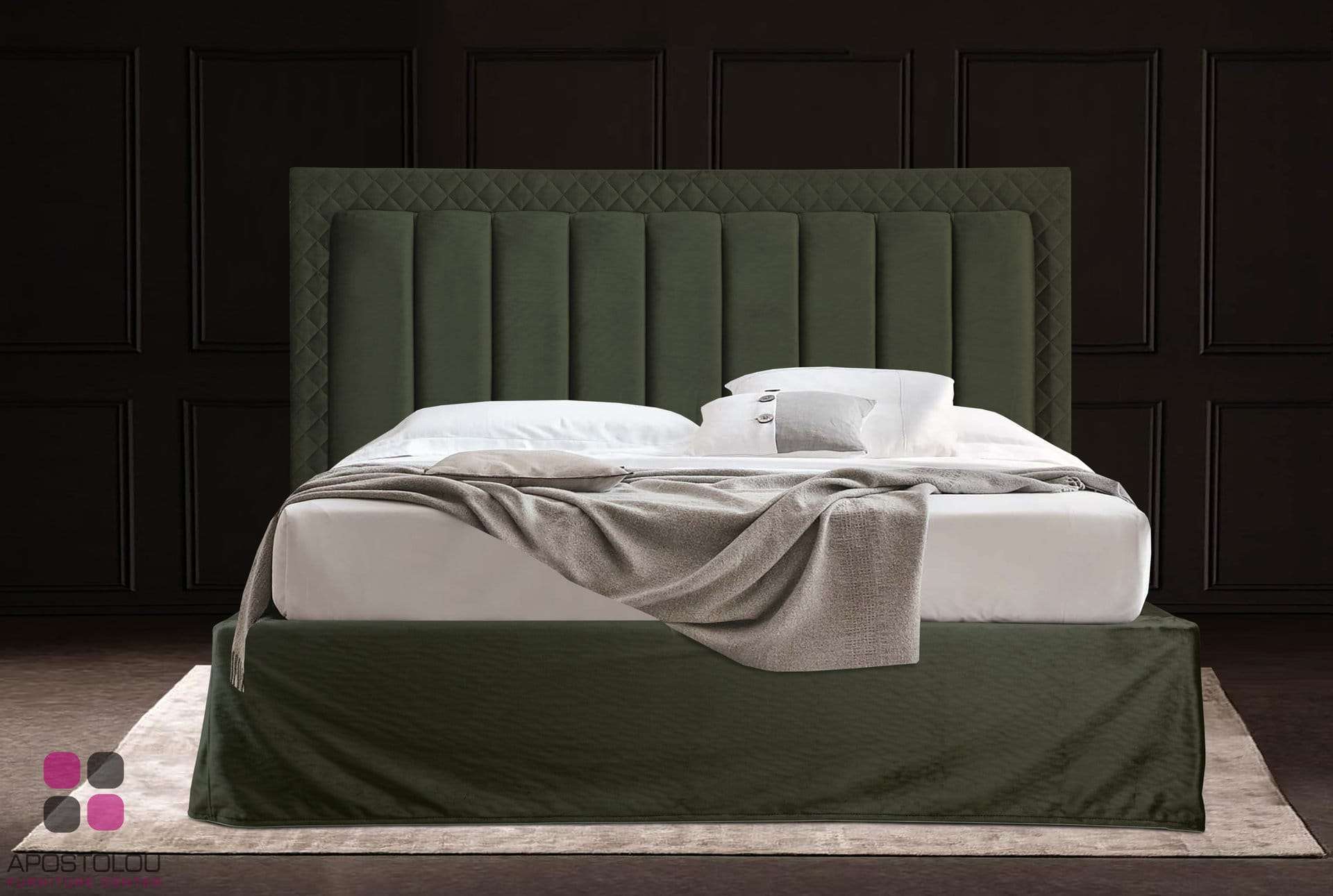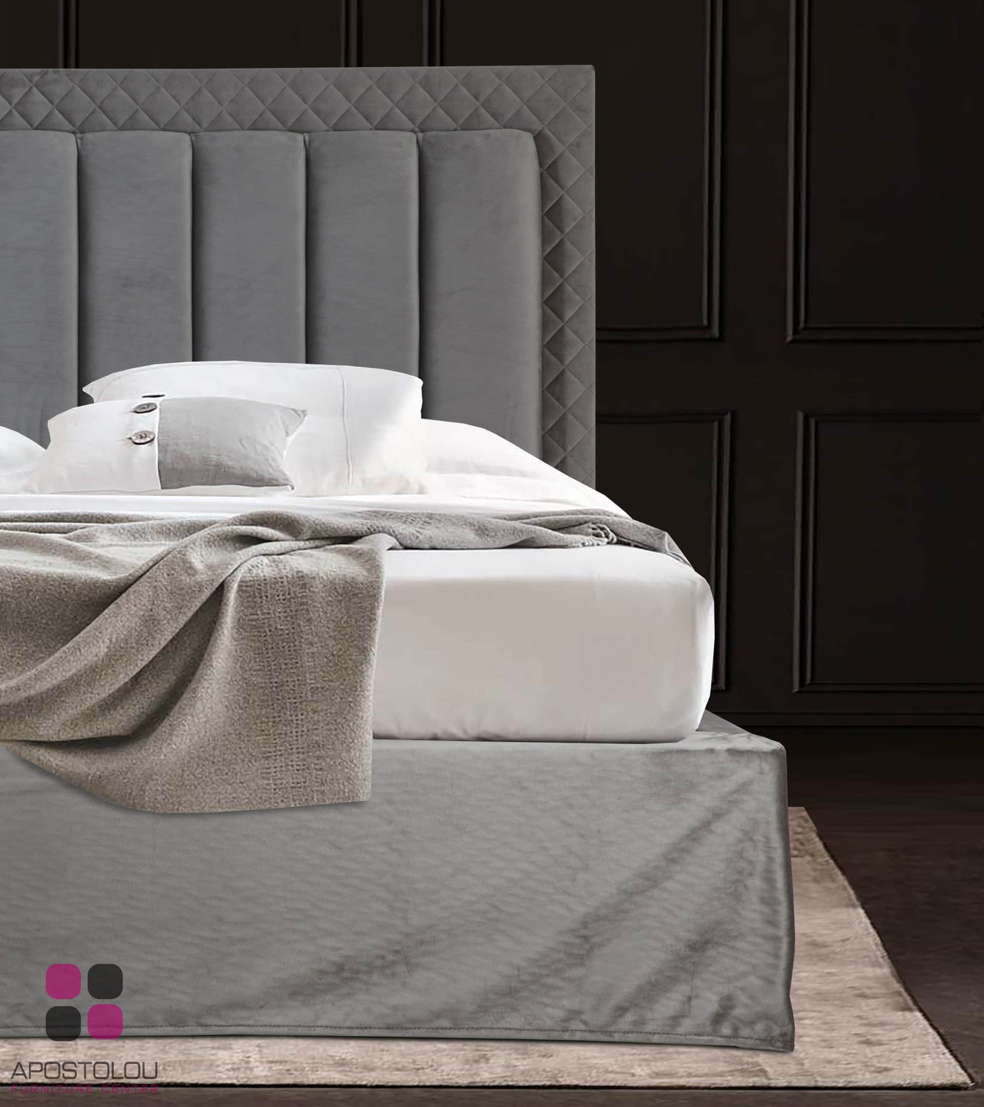 Ντυμένο κρεβάτι με μοντέρνο ύφος υψηλής αισθητικής με ψηλό και επιβλητικό κεφαλάρι με χειροποίητο ράψιμο. Παράγετε σε πολλές διαστάσεις και μεγάλη ποικιλία αδιάβροχων και easy-clean υφασμάτων.
