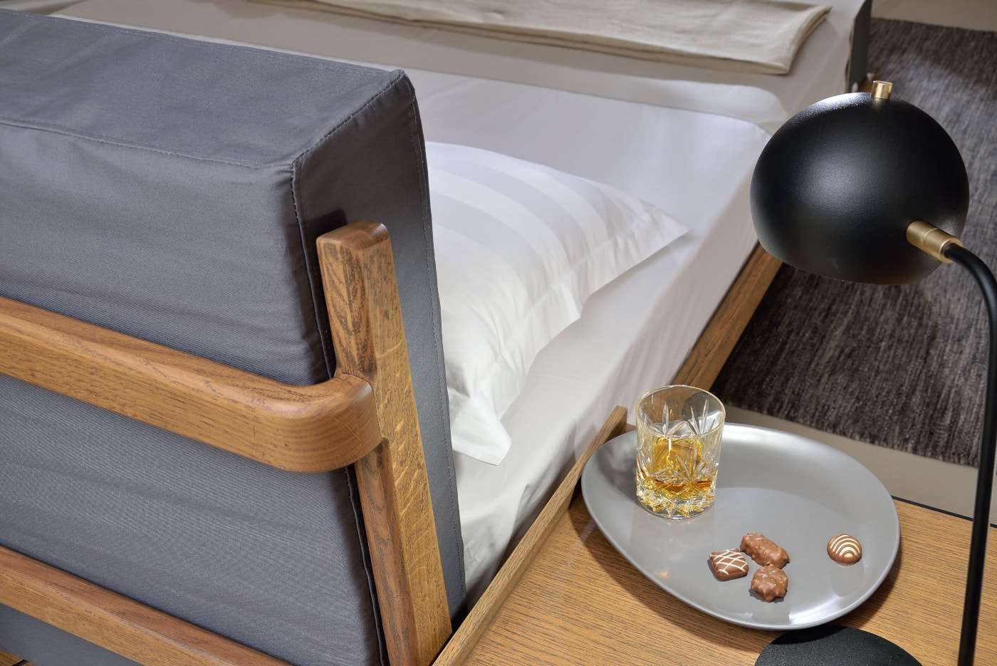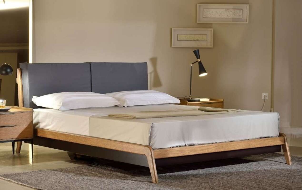 Κρεβάτι με δομή από μασίφ ξύλο και εσωτερική λεπτομέρεια λακαρισμένου πλαισίου που περιβάλλει την ξύλινη βάση. Δύο μεγάλα μαξιλάρια βρίσκονται στο κεφαλάρι.
