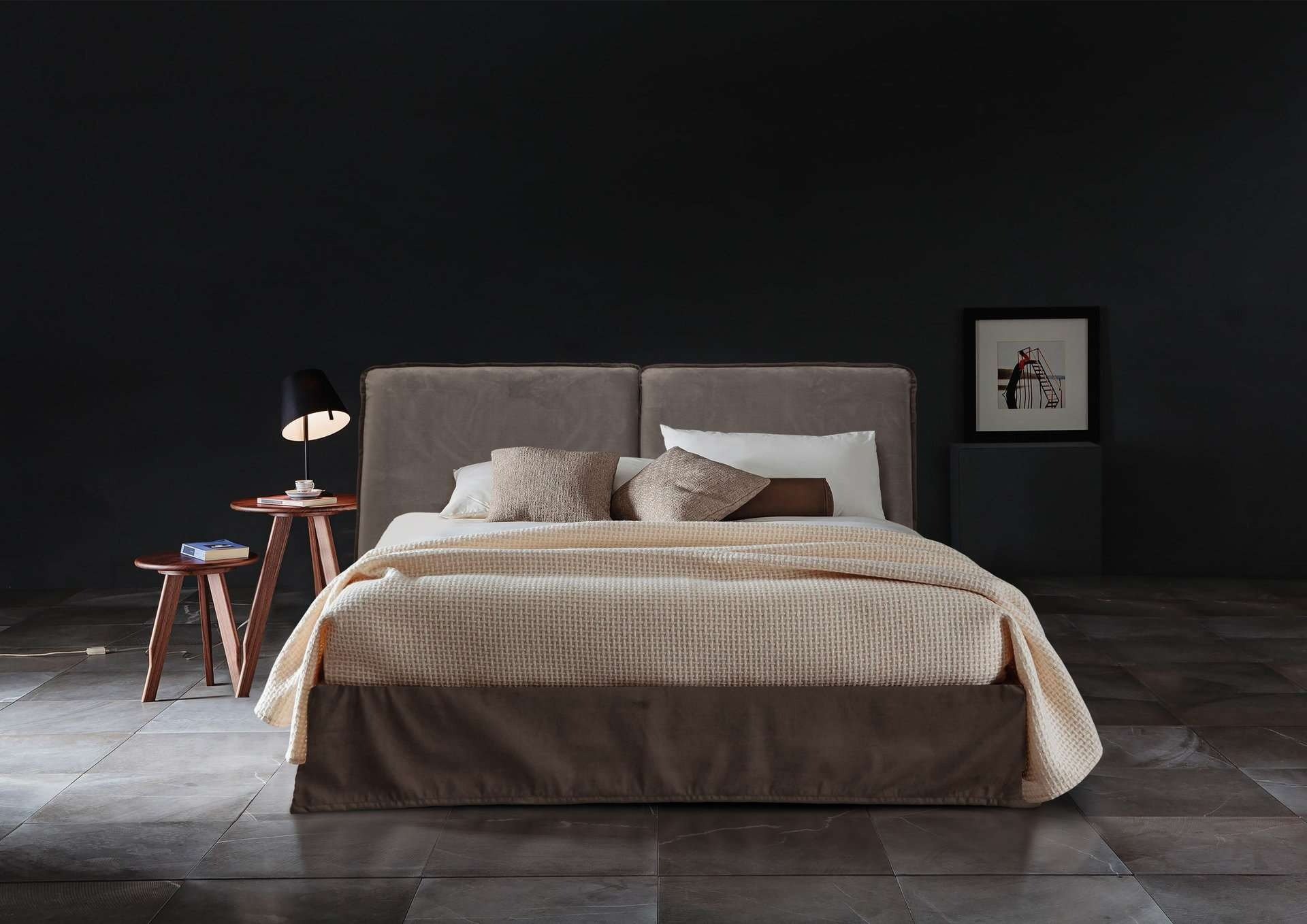 Ντυμένο κρεβάτι με μοντέρνο ύφος υψηλής αισθητικής με ψηλό και επιβλητικό κεφαλάρι του με χειροποίητο ράψιμο και φορετό. Παράγετε σε πολλές διαστάσεις και μεγάλη ποικιλία αδιάβροχων και easy-clean υφασμάτων.