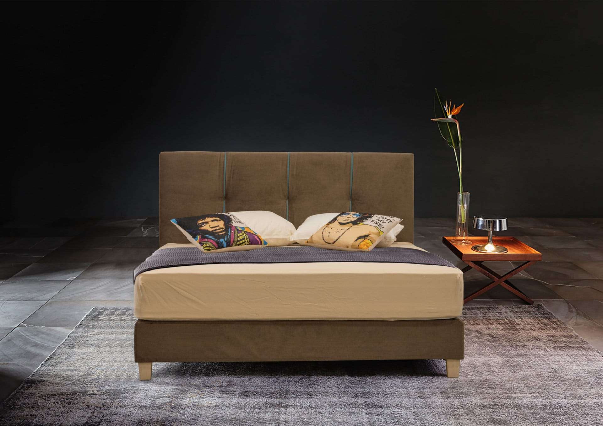 Ντυμένο κρεβάτι με μοντέρνο ύφος υψηλής αισθητικής με ψηλό και επιβλητικό κεφαλάρι του με χειροποίητο ράψιμο. Παράγετε σε πολλές διαστάσεις και μεγάλη ποικιλία αδιάβροχων και easy-clean υφασμάτων.