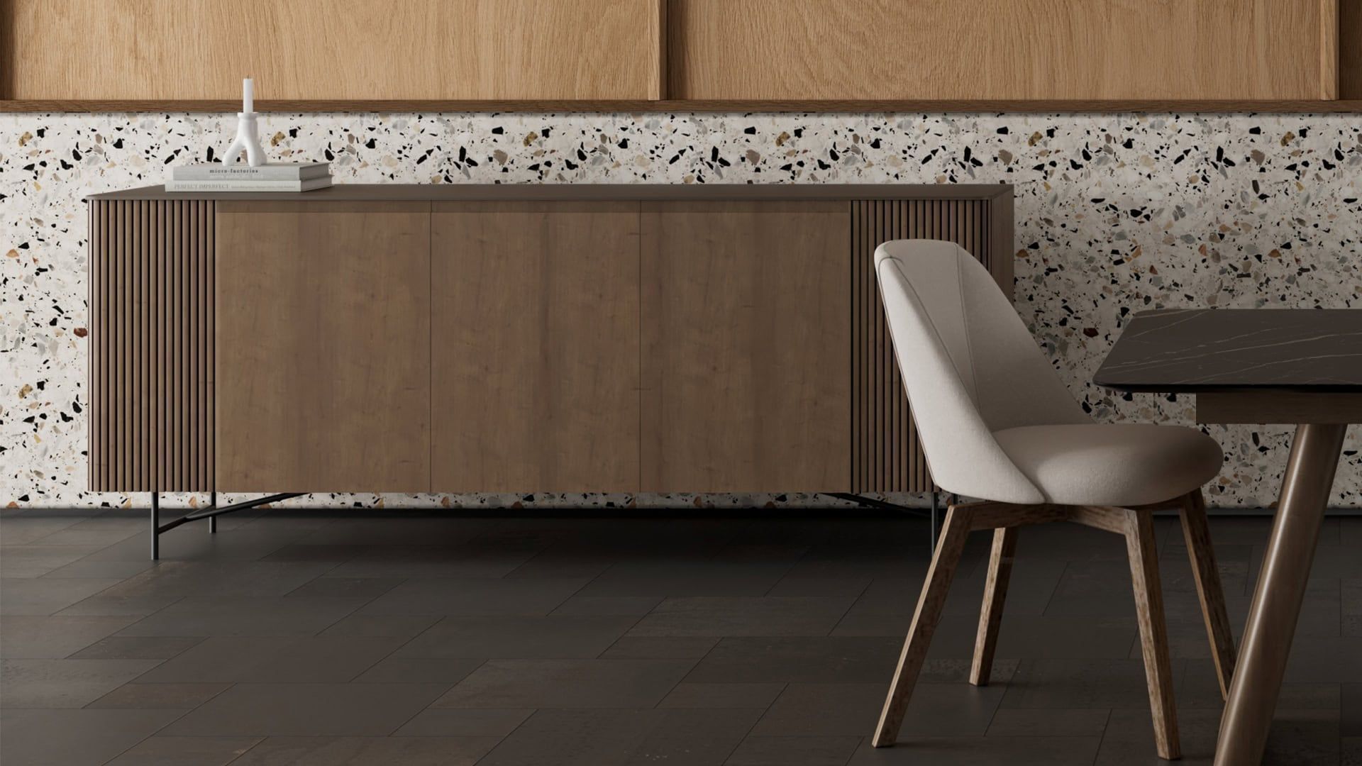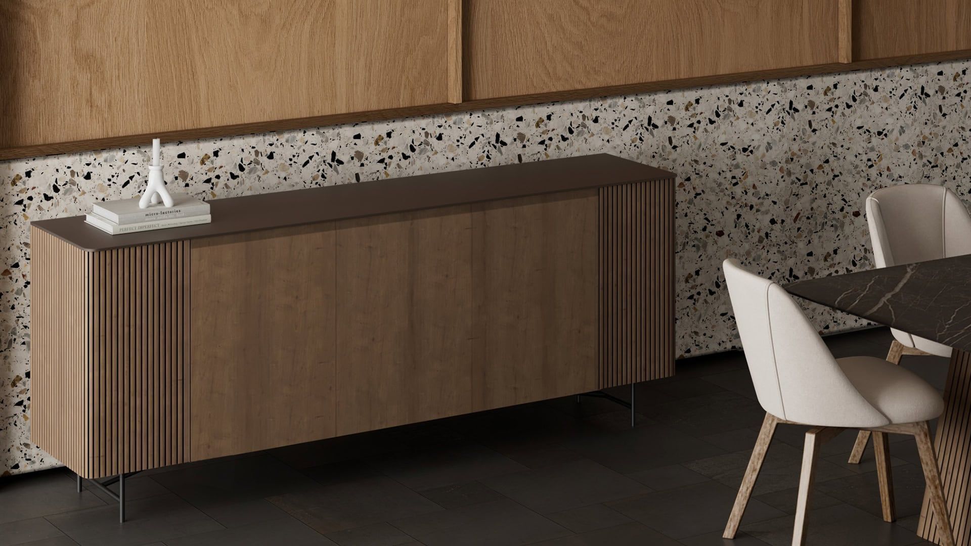 Μπουφές Flux σε δρυ. Σχεδιασμό με τρείς πόρτες και μεγάλους αποθηκευτικούς χώρους. Παράγεται σε διαστάσεις και χρώματα της επιλογής σας.