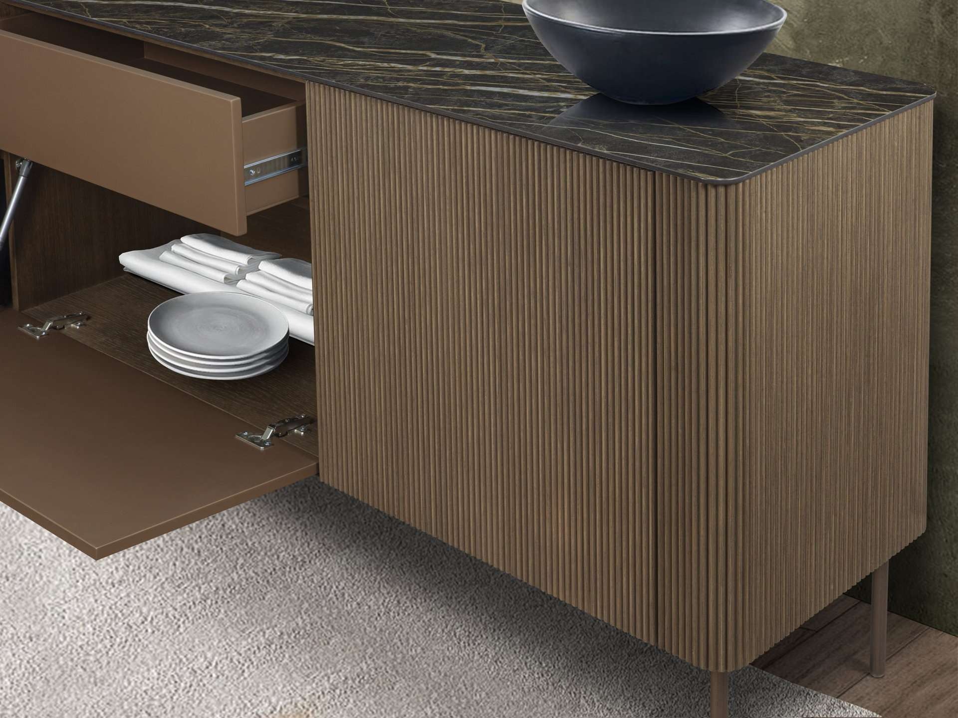 Μοντέρνος μπουφές Ελληνικής κατασκευής, με κεραμική επιφάνεια, ευκάλυπτο μασίφ δρυς, λάκα και μεταλλικά πόδια.
