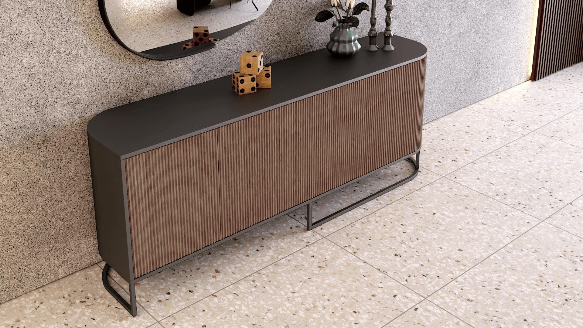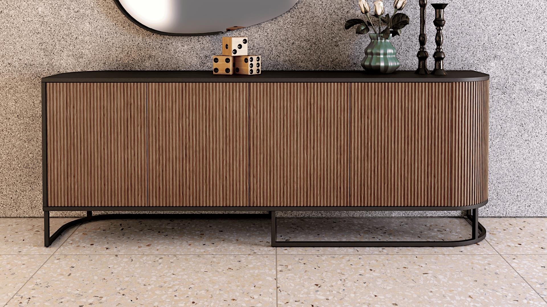 Μπουφές Sabbia. Ελληνικής Κατασκευής. Ξύλο δρυς και λάκα. Διάσταση: 220cm x 50cm x 82cm Ιδιαίτερο design με κούρμπες στις άκρες. Επένδυση στις πόρτες με πηχάκια σε χρώματα της αρεσκέιας σας. Δυνατότητα αλλαγών.