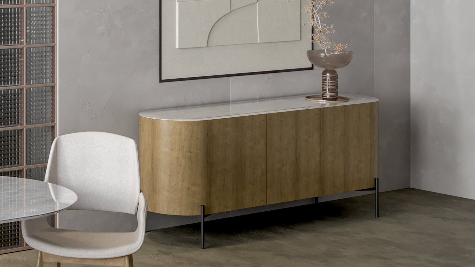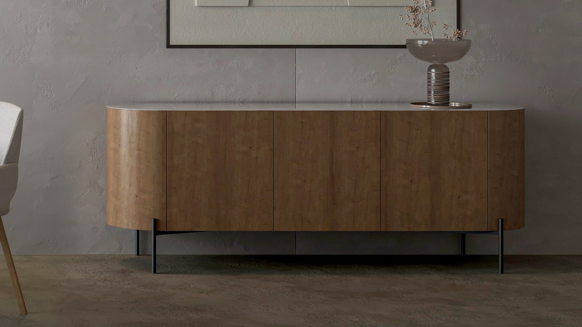 Μπουφές Torus με δρυς, κεραμικό και μεταλλικά πόδια. Δυνατότητα αλλαγής διαστάσεων, επιλογής ξύλου και κεραμικής επιφάνειας