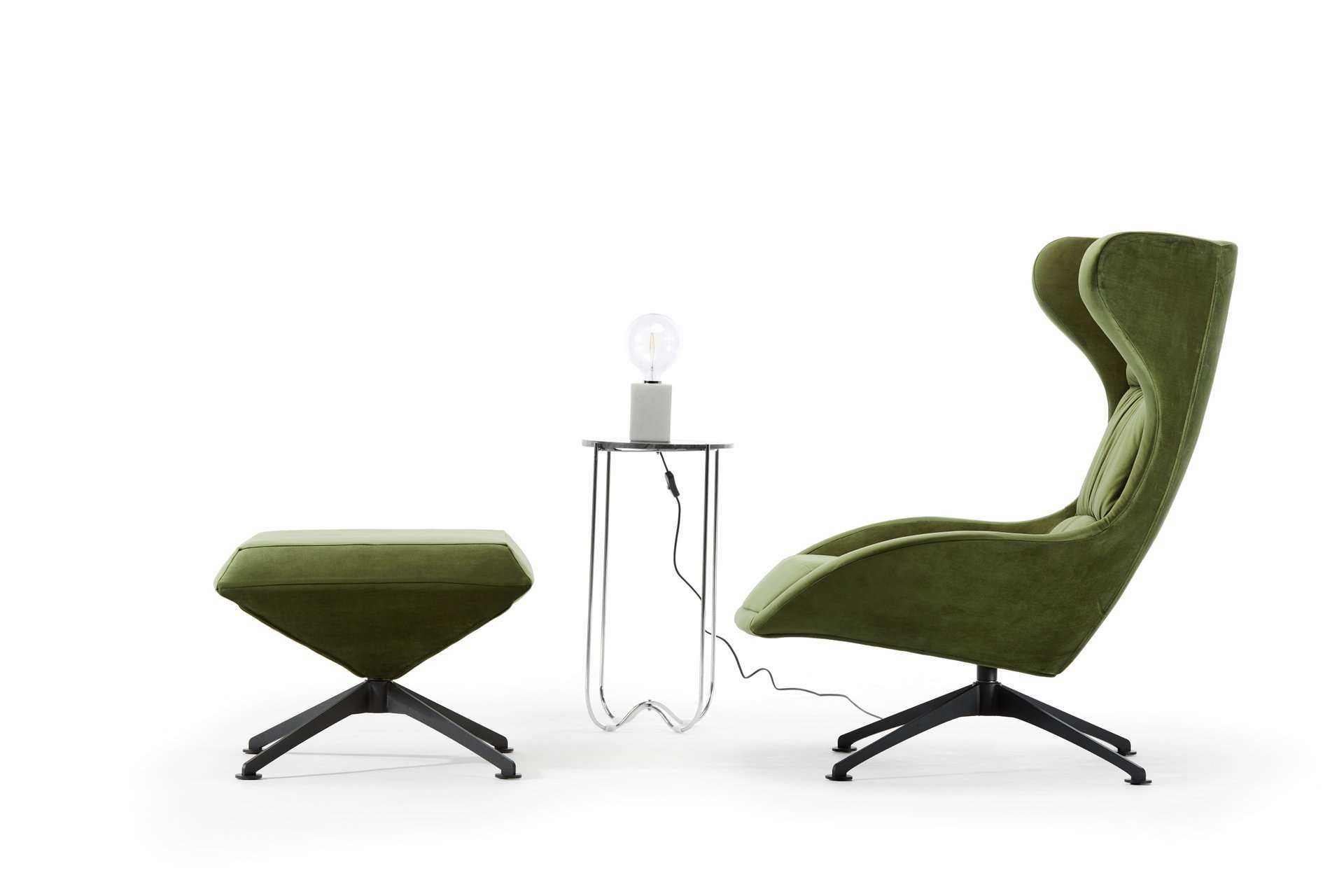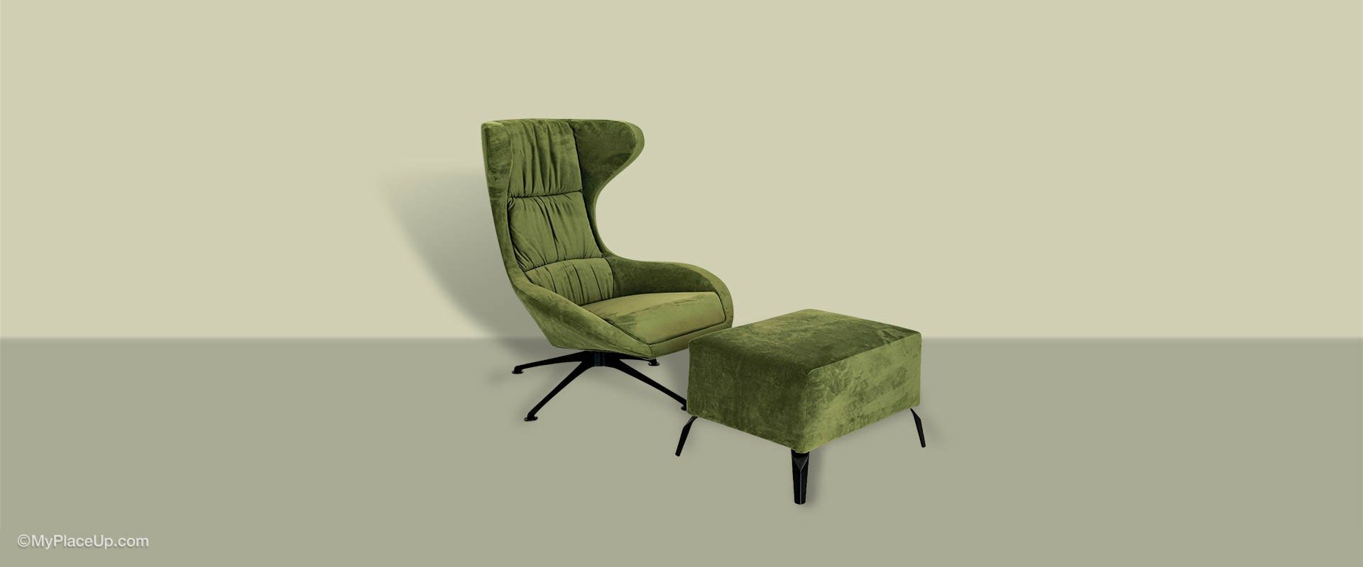 Η πολυθρόνα είναι περιστρεφόμενη με εντυπωσιακό σχεδιασμό. Η ιδιαίτερη φόρμα της, την κατατάσσει στην κατηγορία του αμιγώς μοντέρνου design. Το υλικό κατασκευής του σκελετού είναι από μασίφ μέταλλο και πολυουρεθάνη. Το ύφασμα είναι βαμβάκι με viscose.