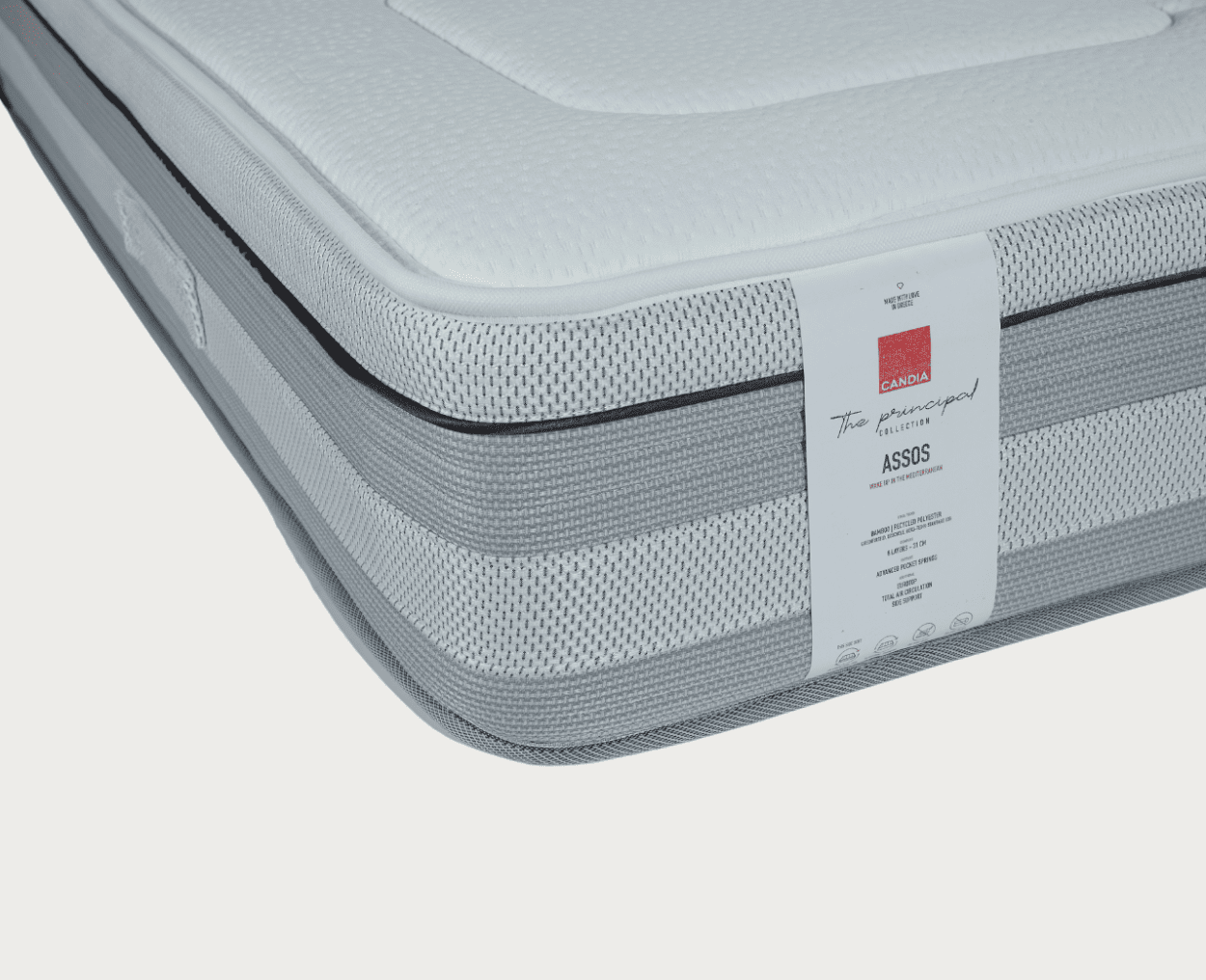 Το απλό ανάγλυφο του στρώματος ASSOS, δεν μαρτυρά την πολυπλοκότητα της σύνθεσης στο εσωτερικό του. Advanced Support σύστημα υψηλότερων ελατηρίων, πυκνά αφρώδη υλικά Soft Touch Foam, ανώτερη επίστρωση από Dacron Pad για υψηλή αίσθηση άνεσης.