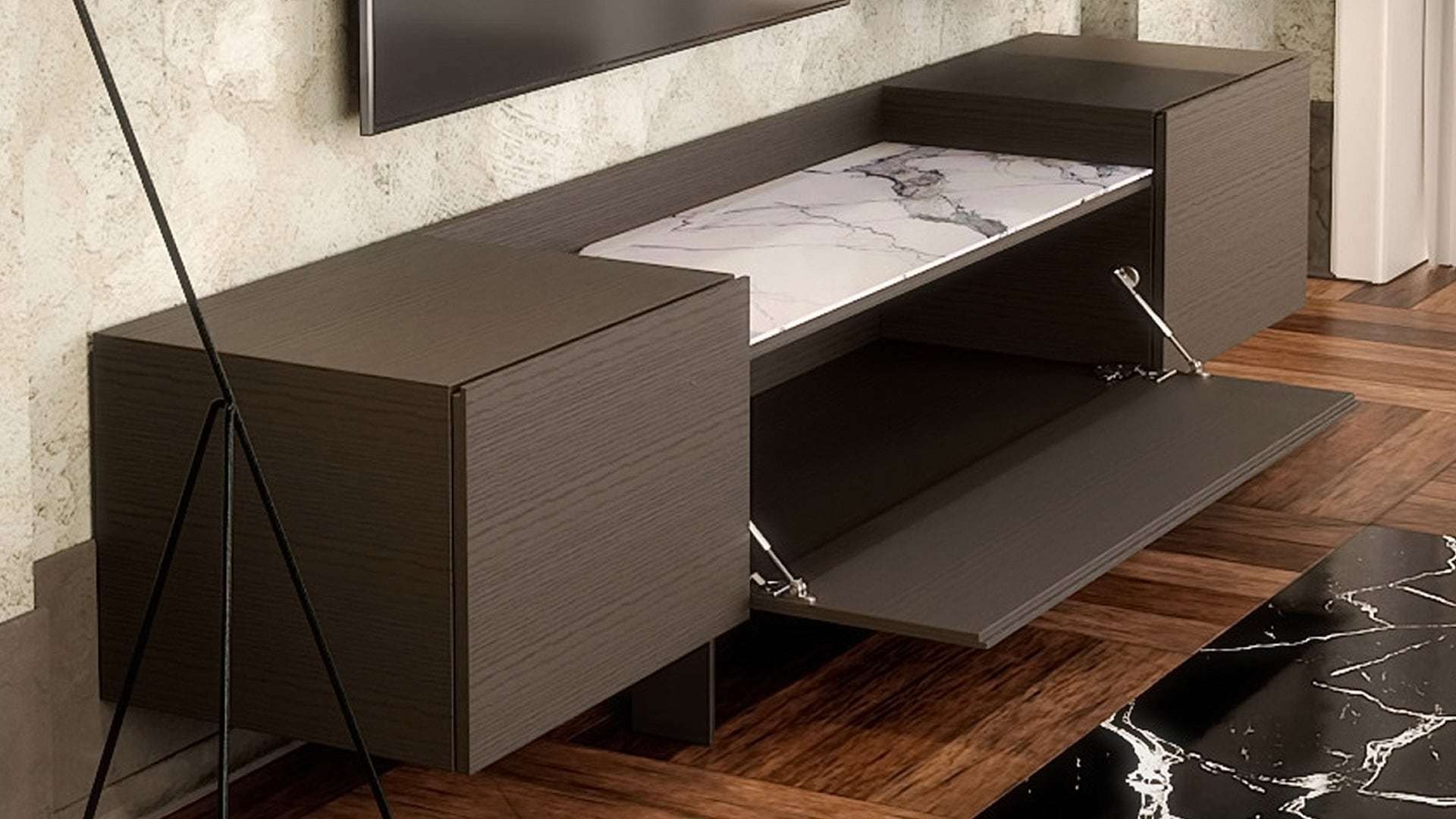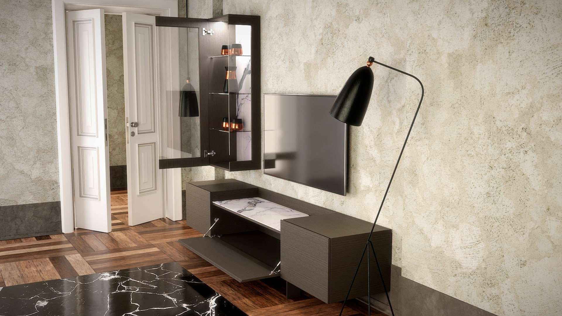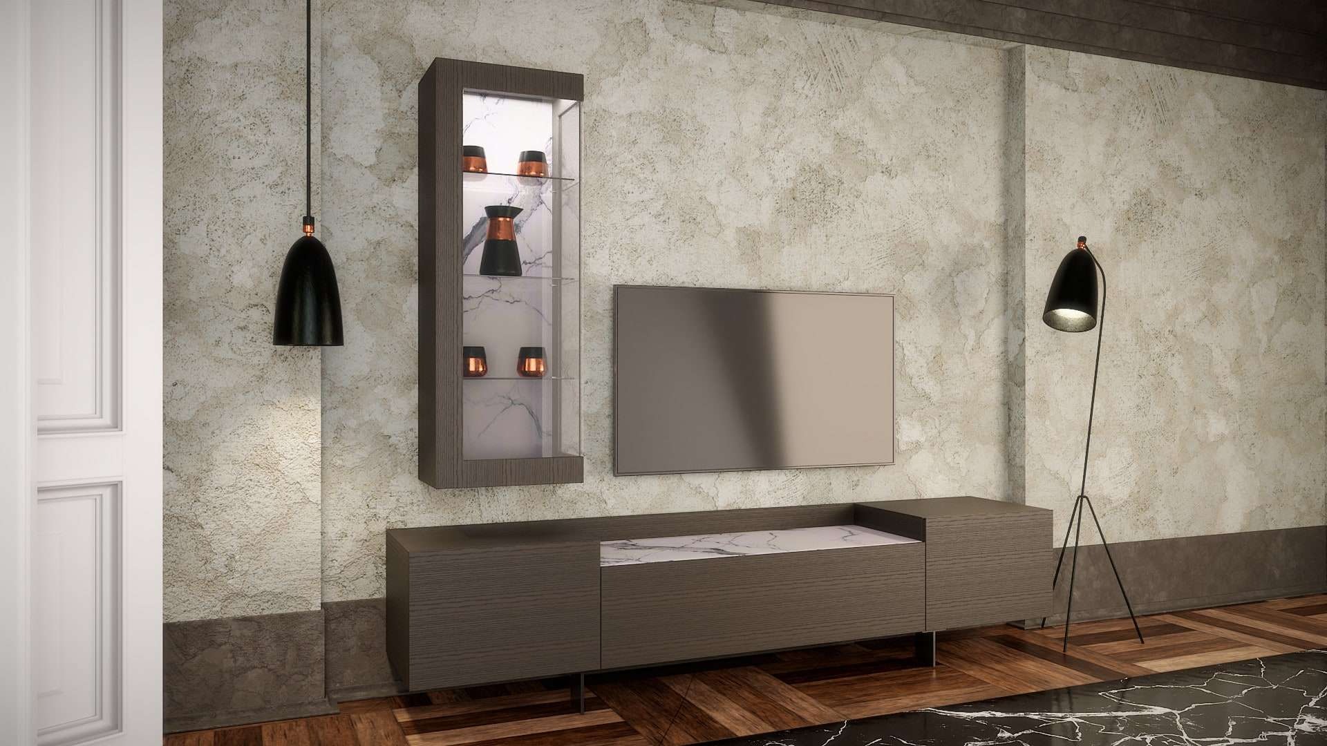 Το σύνολο συμπληρώνει η elegant κάθετη βιτρίνα με την κεραμική επιφάνεια στην πλάτη και τον ατμοσφαιρικό κρυφό φωτισμό. Η σύνθεση τοίχου Crema κατασκευάζεται σε διαστάσεις, ξύλο και χρώματα της επιλογής σας.