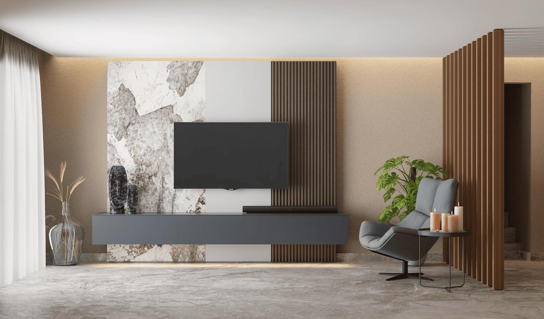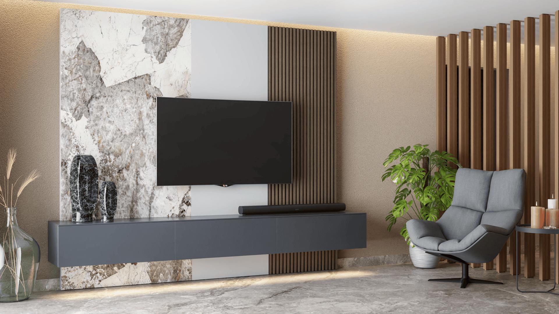 Σύνθεση Nalu. Ελληνικής Κατασκευής. Ξύλο δρυς με λάκα και κεραμικό. Διάσταση σύνθεσης: 300cm x 45cm x 245cm Δυνατότητα αλλαγών.