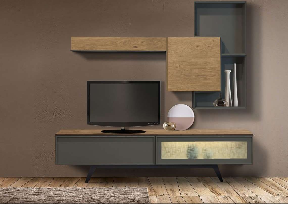 Σύνθεση Play με ξύλο ρουστίκ και λεπτομέρειες λάκας με επιλογή χρώματος. Βιτρίνα με τζάμι στο έπιπλο TV και κρυφό φωτισμό που θα δώσει έντονο χαρακτήρα στο σαλόνι σας. Κατασκευάζεται με φυσικά υλικά σε χρώματα και διαστάσεις της επιλογής σας.