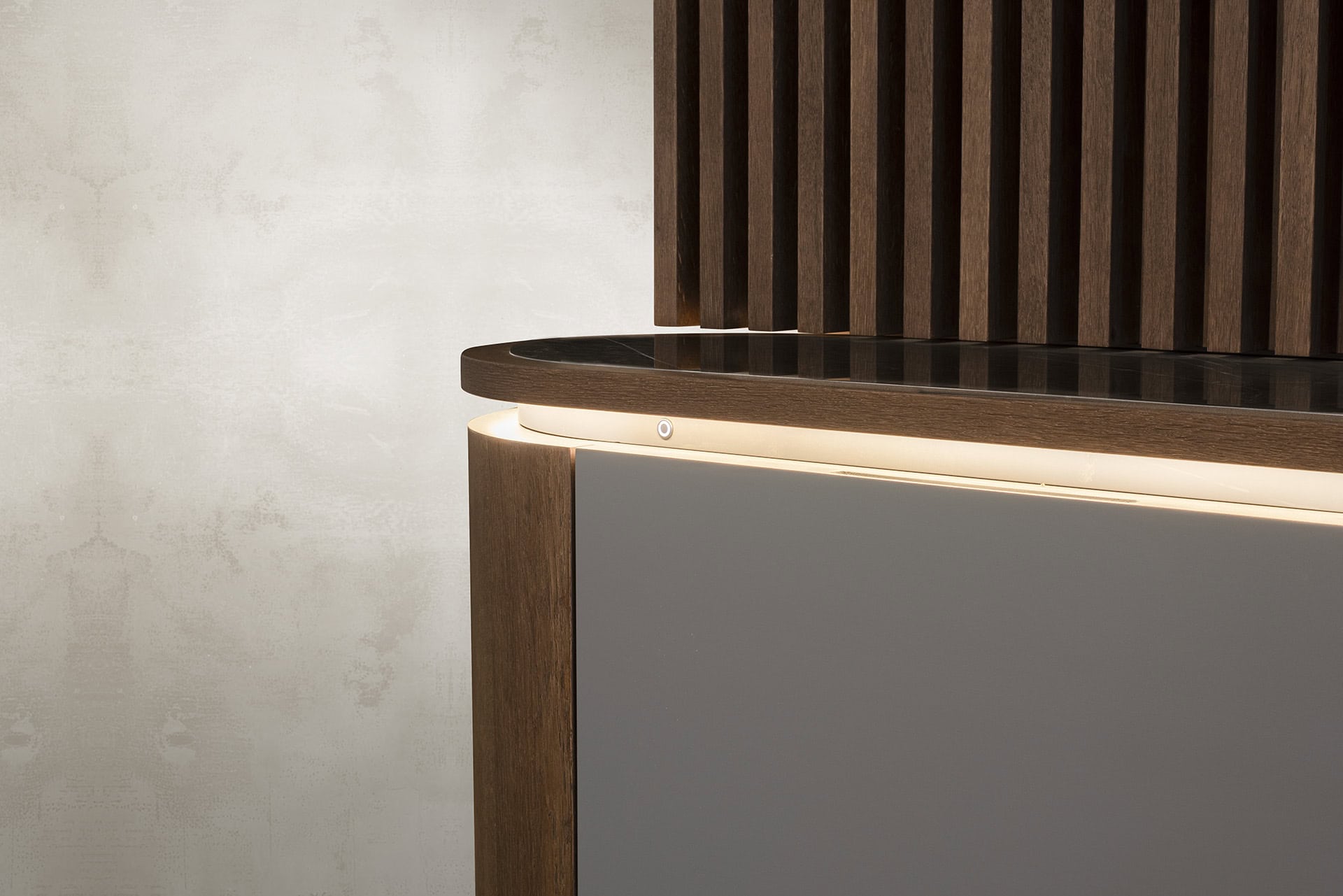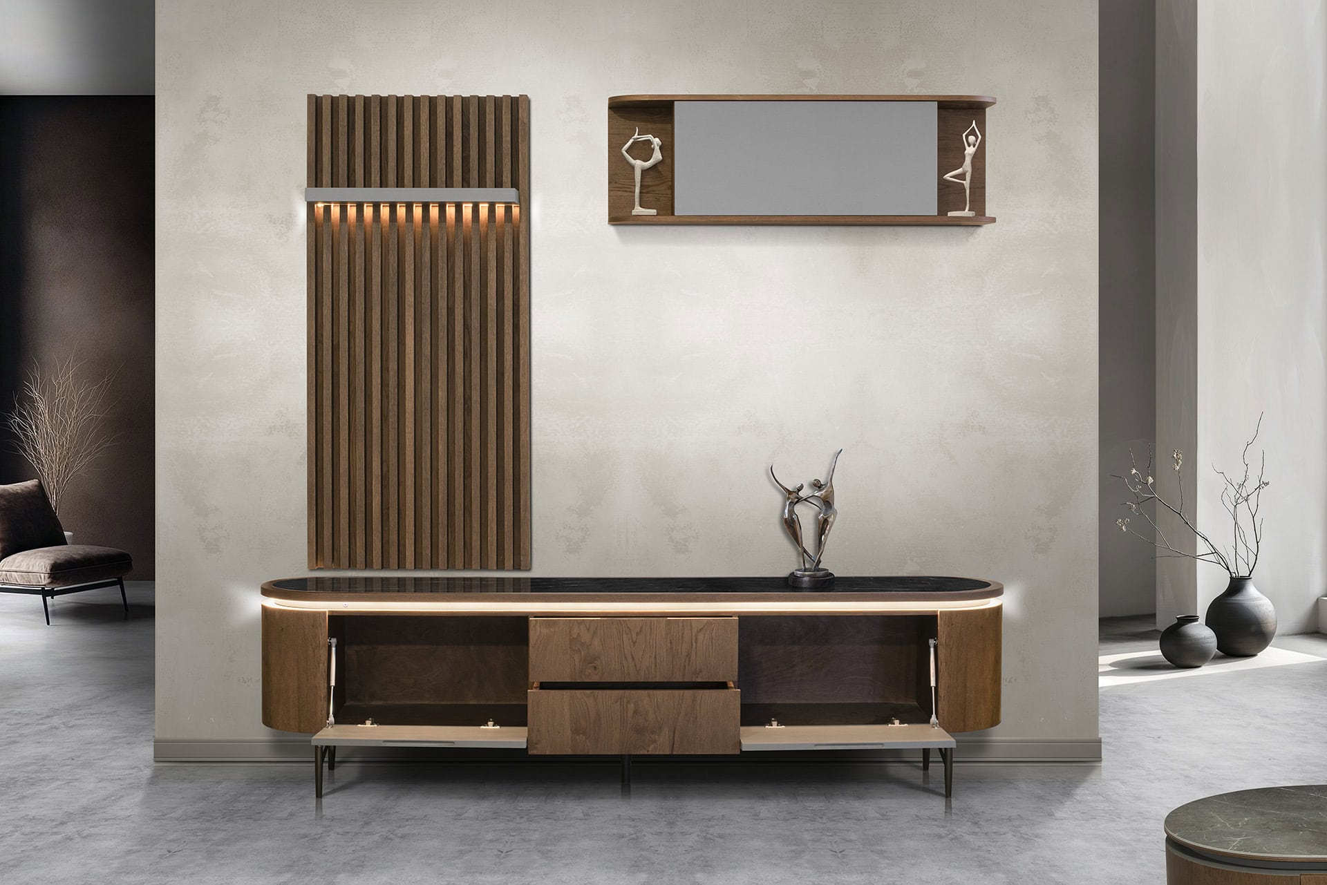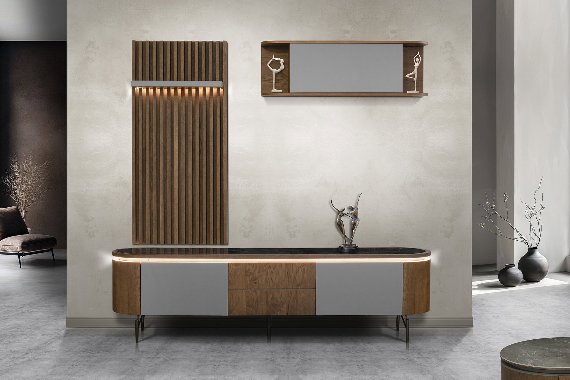 Σύνθεση Σ23. Ελληνικής Κατασκευής. Ξύλο δρυς με πηχάκια και κεραμική επιφάνεια. Διάσταση σύνθεσης: 230cm x 45cm Λεπτομέρειες λάκας και φωτισμό led Έπιπλο TV διάσταση 230cm x 45cm 55cm h Δυνατότητα αλλαγών.