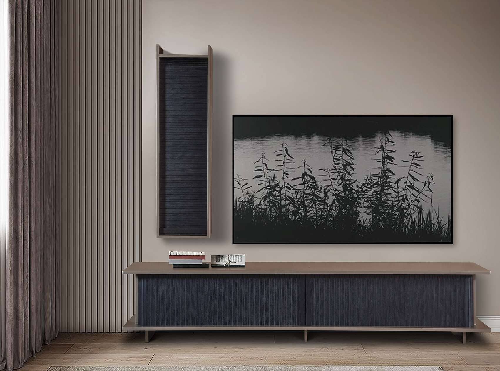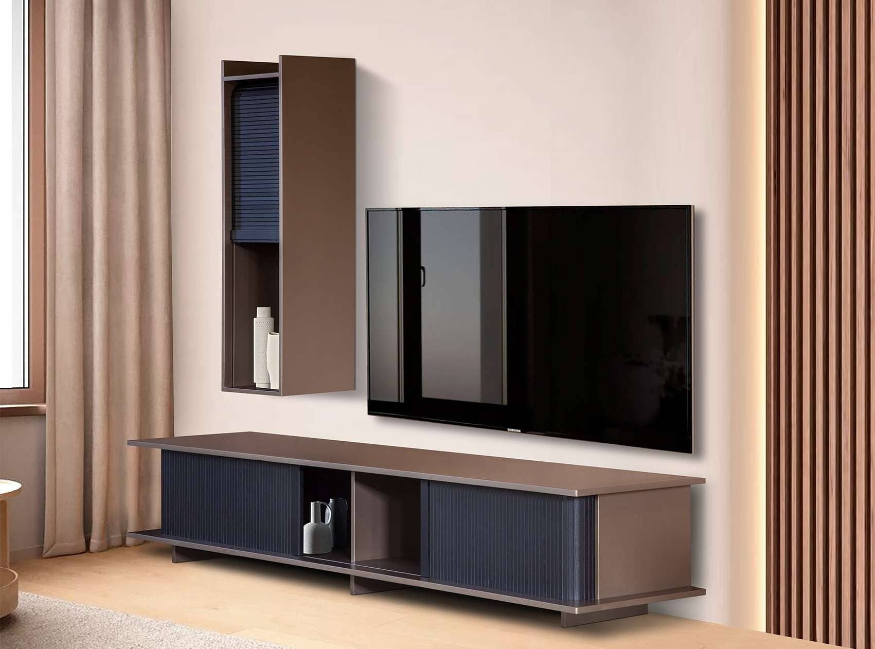 Σύνθεση Slide λάκας με επιλογή χρώματος και ξύλινα πηχάκια συρόμενα Έξυπνος σχεδιασμός που συνδυάζει, λιτές γραμμές αλλά μεγάλους χώρους αποθήκευσης. Κατασκευάζεται σε χρώματα και διαστάσεις της επιλογής σας.