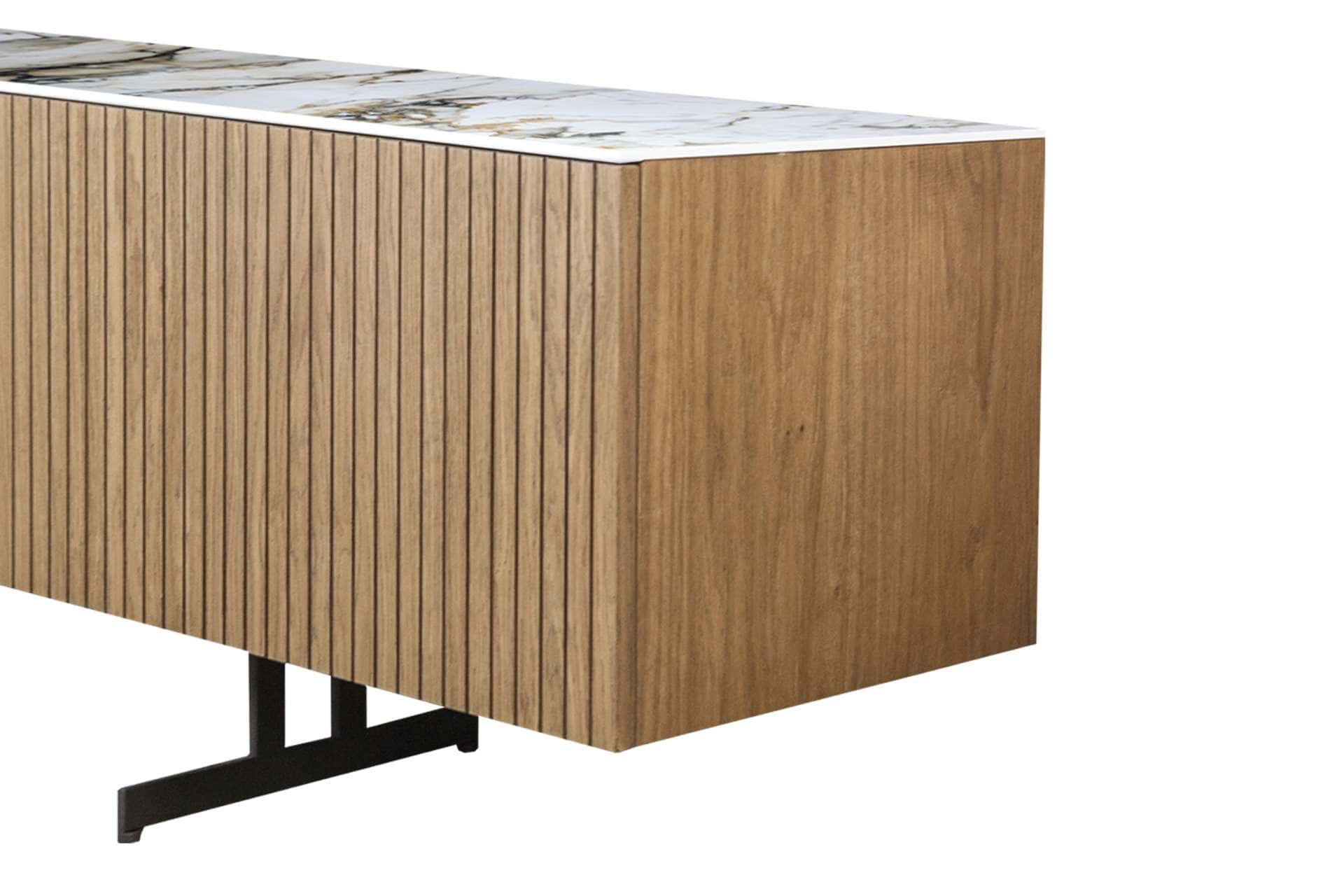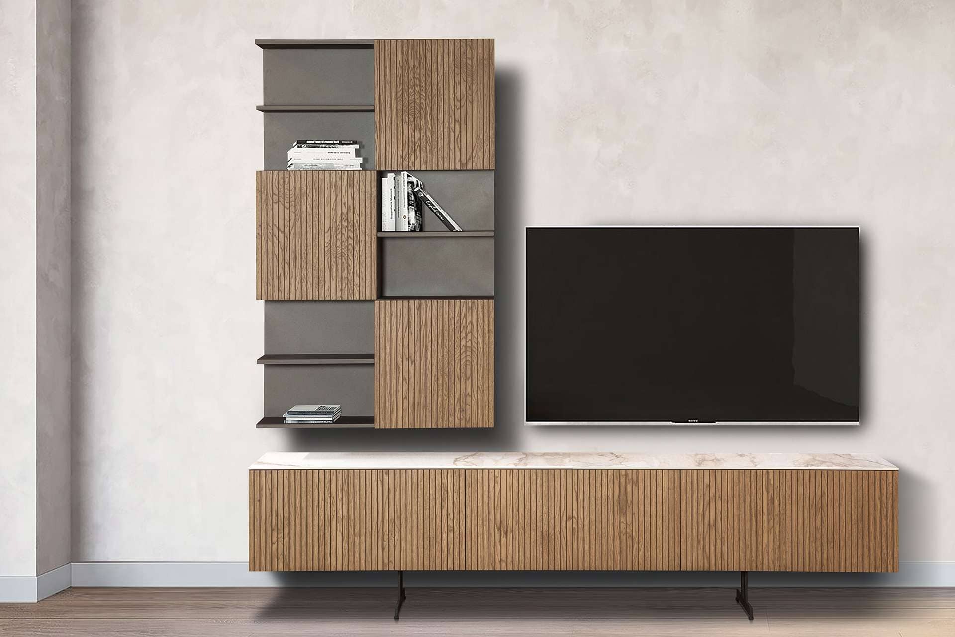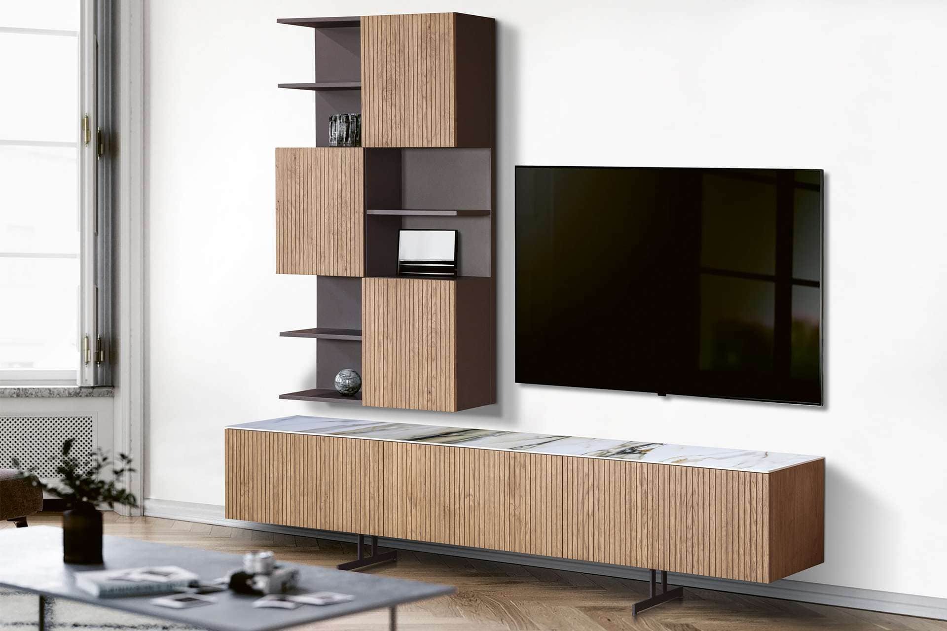 Σύνθεση Stripe με εύκαμπτο μασίφ δρυς και λεπτομέρειες λάκας με επιλογή χρώματος. Κεραμική επιφάνεια στο έπιπλο tv που θα δώσει έντονο χαρακτήρα στο σαλόνι σας. Κατασκευάζεται με φυσικά υλικά σε χρώματα και διαστάσεις της επιλογής σας.